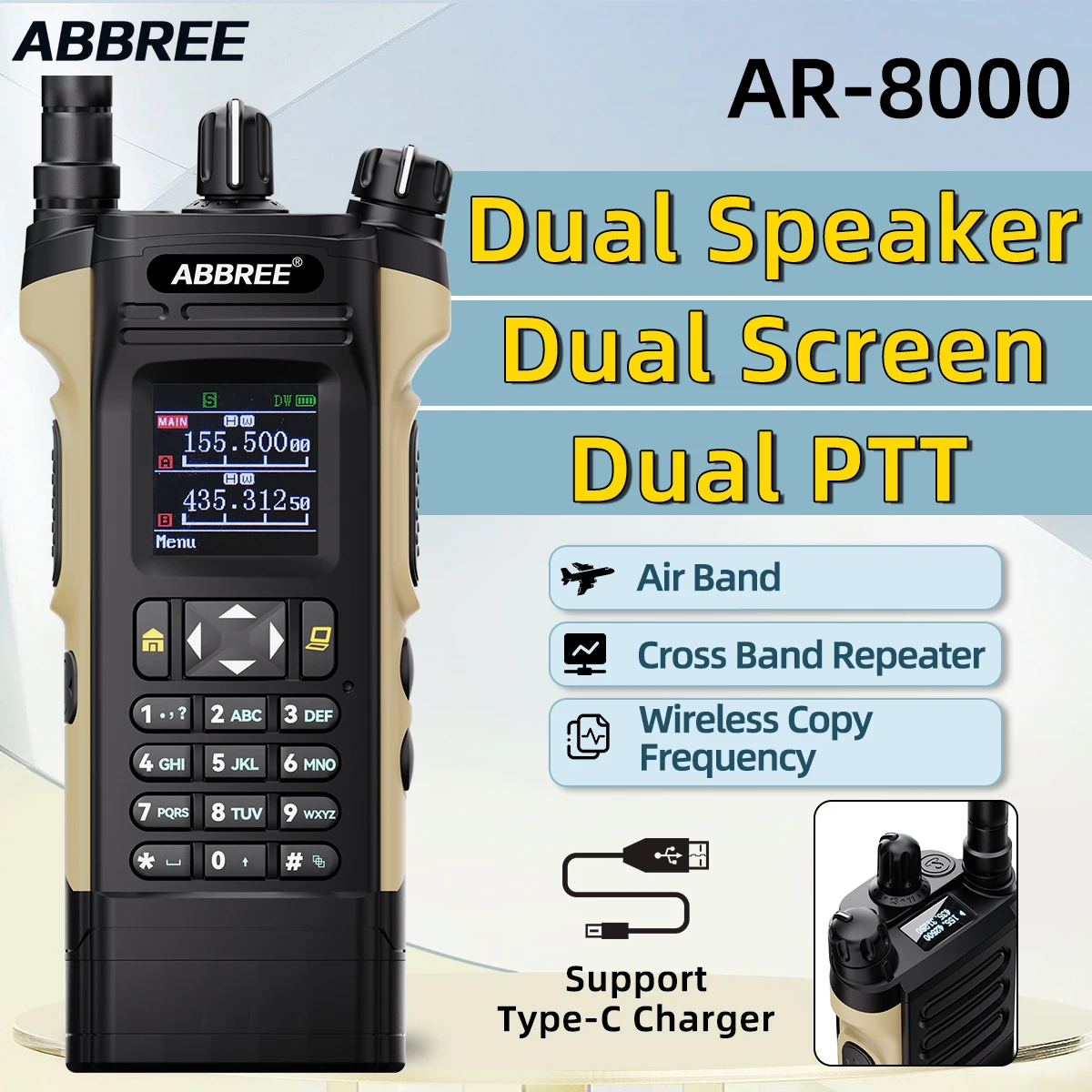 Hasta 128 canales, alta potencia de 12 W, frecuencia de aviación, radio FM, modo repetidor de banda cruzada, DTMF, VOX, función de alarma, batería de iones de litio de gran capacidad y otras funciones.