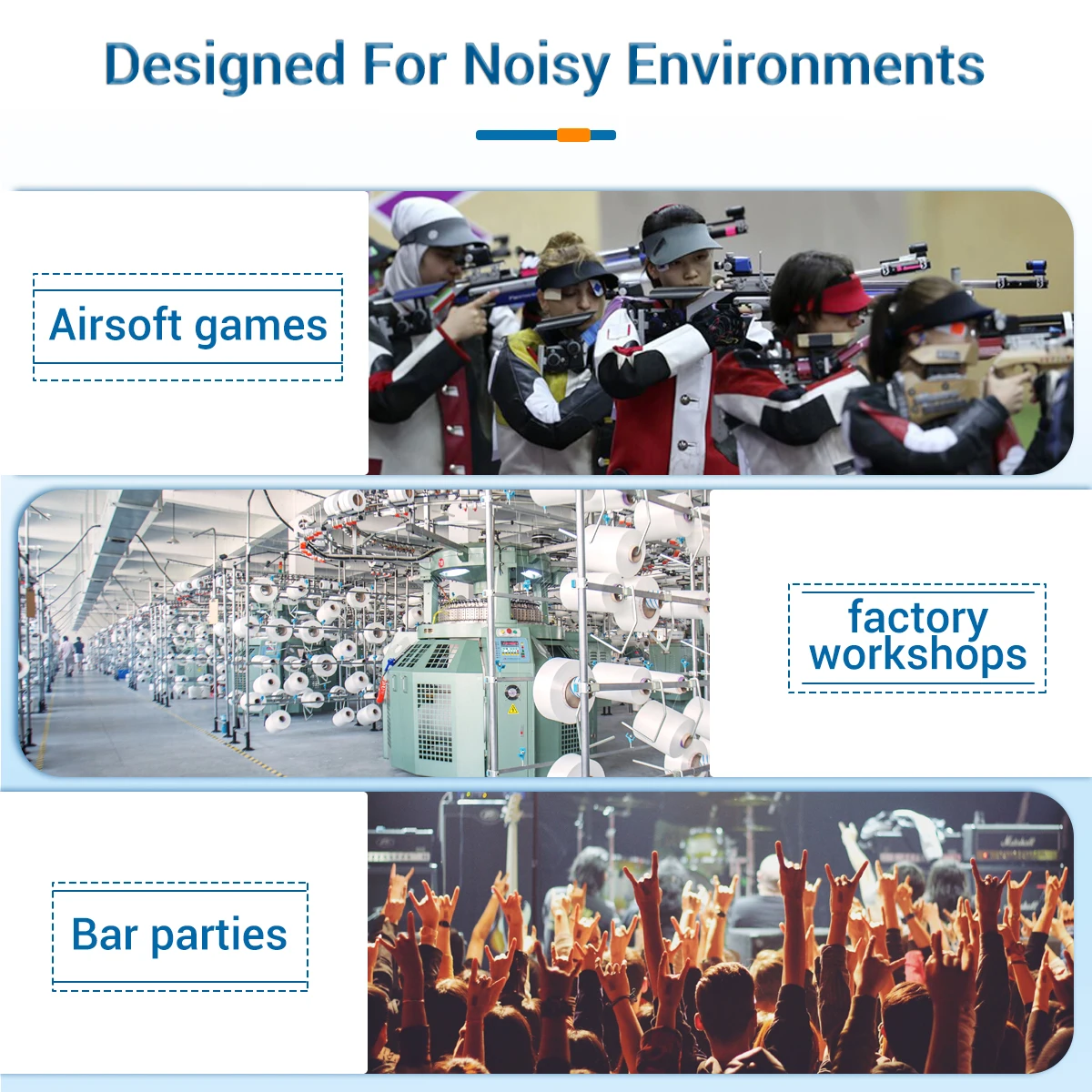 【Lugares aplicables】 Diseñado para entornos ruidosos como caza, ciclismo, juegos de airsoft, viajes de tiro, fiestas en bares, talleres de fábrica y paintball, etc.