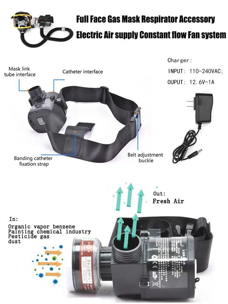 • Nombre del producto: Sistema de respirador de flujo constante de máscara de gas de cara completa con suministro de aire eléctrico