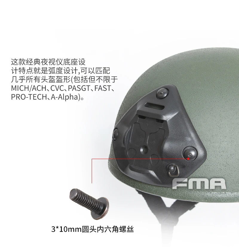Este diseño clásico de base de visión nocturna presenta un diseño curvo que puede coincidir con casi cualquier forma de casco (incluidos, entre otros, MICH/ACH, CVC, PASGT, FAST, PRO-TECH, a-Alfa).