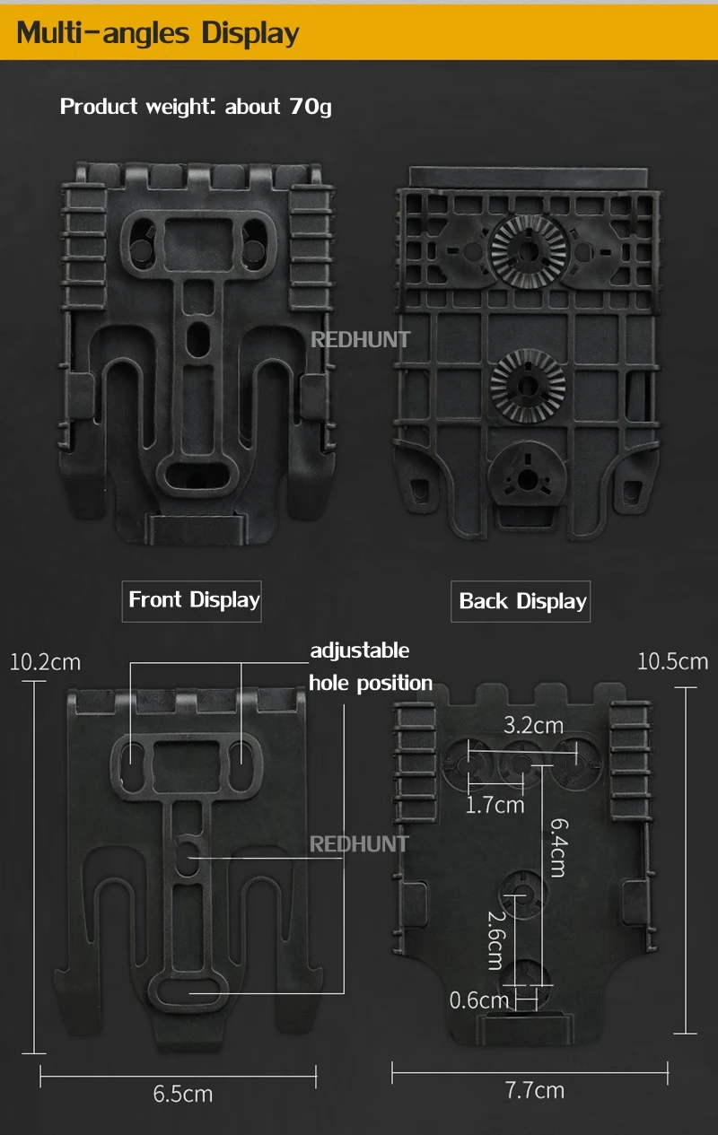Este sistema proporciona una fijación sólida entre su funda y UBL, placa táctica para piernas, chaleco MOLLE, tablero de automóvil, mesita de noche, escritorio, vehículo, o en cualquier otro lugar donde Monte la placa receptora para su arma enfundada.