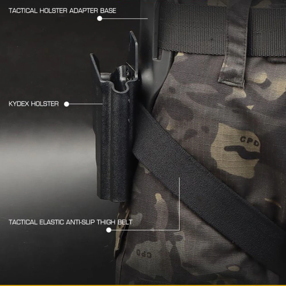Accesorios tácticos antideslizantes súper elásticos para piernas, correa de fijación, lengüeta de liberación rápida Descripción: LA CALIDAD ES 100% NUEVA GARANTIZADA Material: banda elástica Color: negro/bronceado/OD Nota: No incluye funda y adaptador para pistola. Lista de paquetes: 1 * correa para muslo