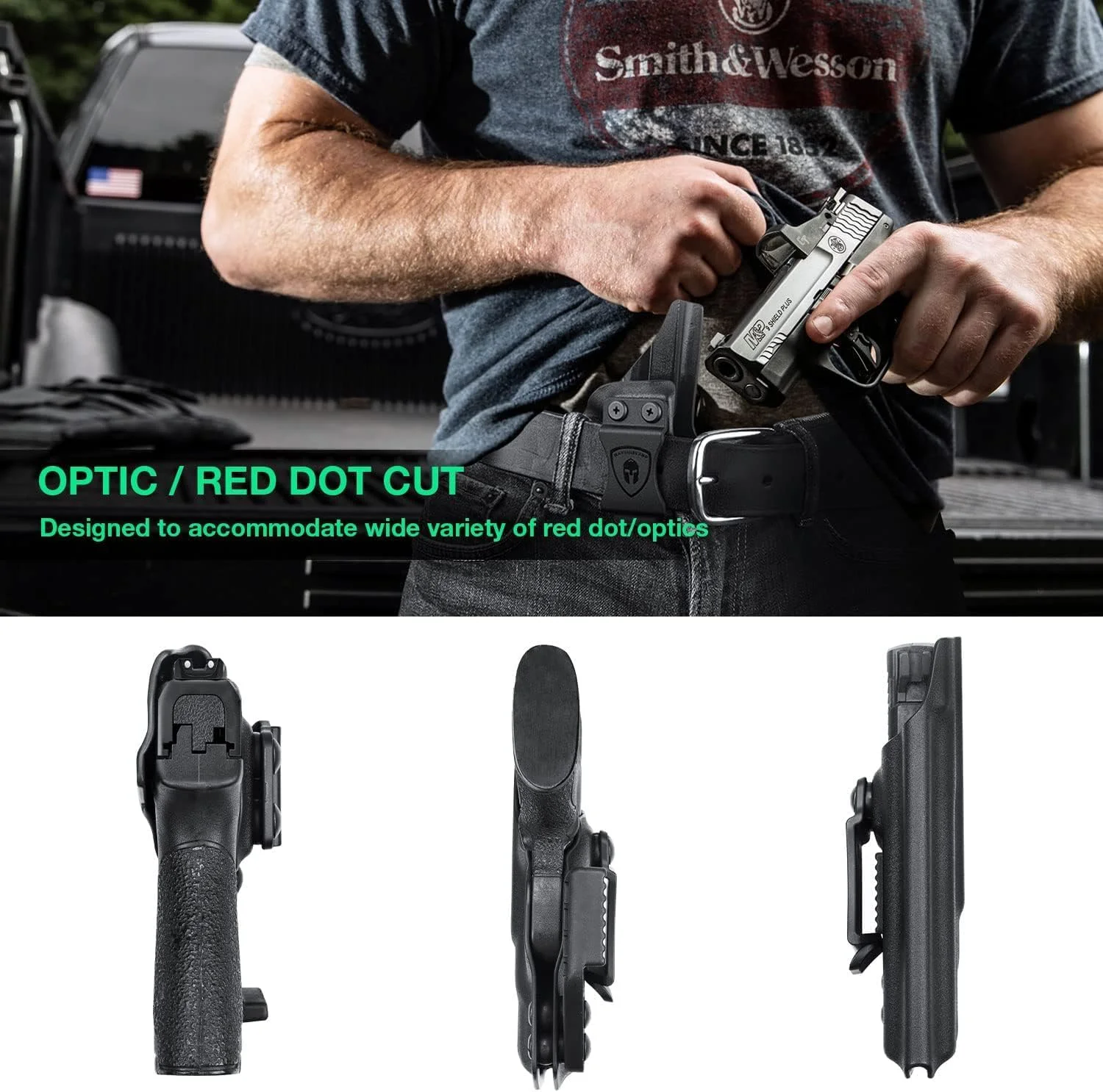 HECHO KYDEX DE 0,08 PULGADAS DE EE. UU.: esta funda IWB está hecha de Kydex de 0,08" (2 mm) fabricado en EE. UU., que posee caracteres resistentes, duraderos, impermeables, lavables y livianos. Súper adecuada para el transporte oculto diario.