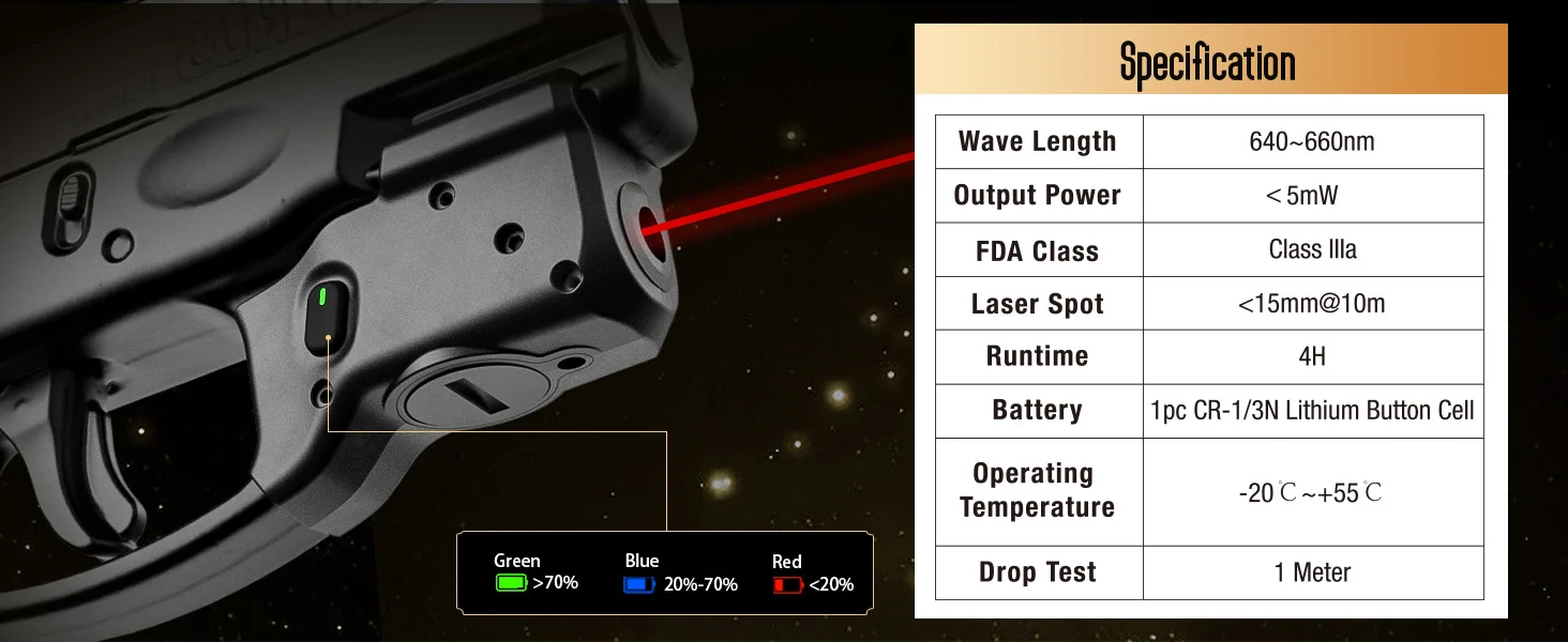 La primera mira láser está equipada con un indicador de encendido en el mercado, siempre prepárese para eventos tácticos y protección.El indicador muestra verde cuando el nivel de la batería está entre un 70% y un 100 %, azul entre un 20% y un 70 %, rojo entre un 0 y un 20 %.