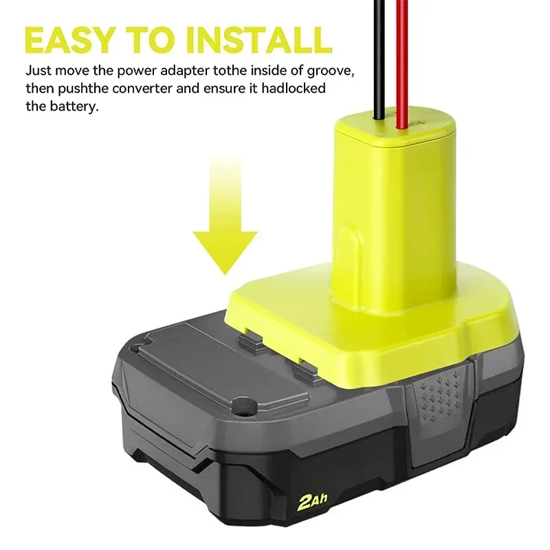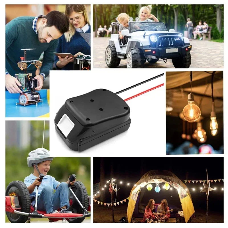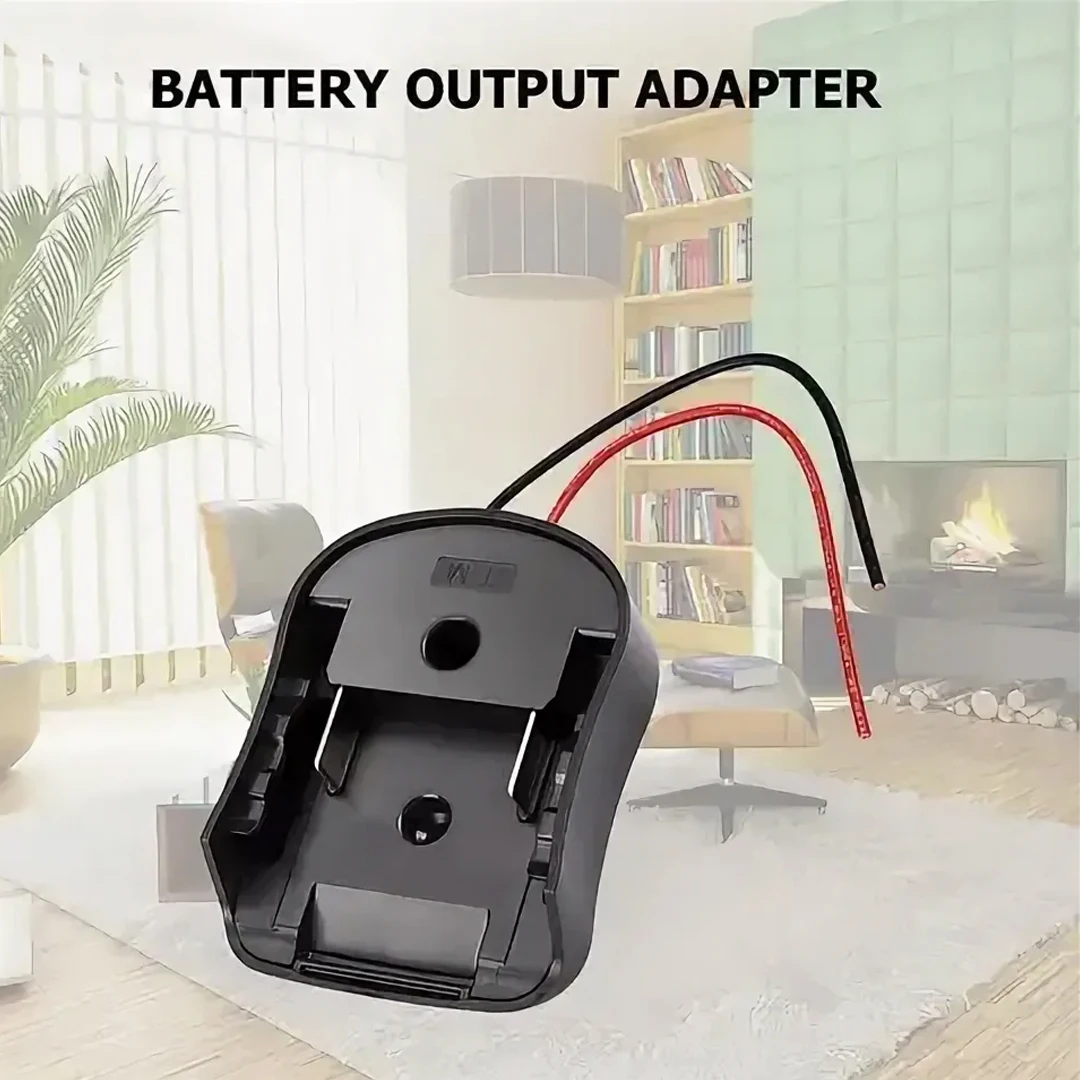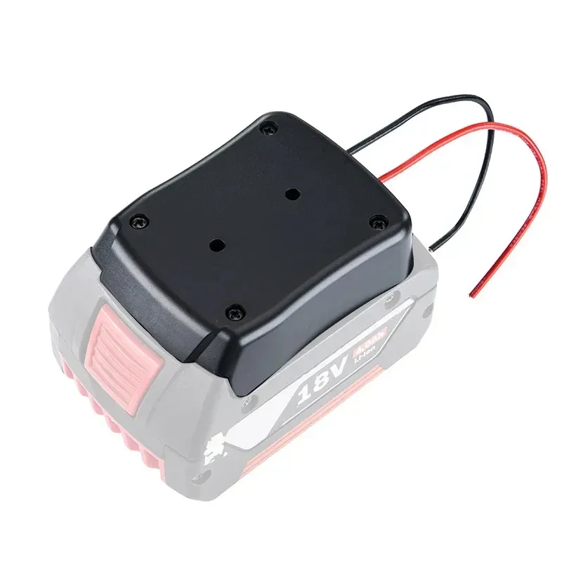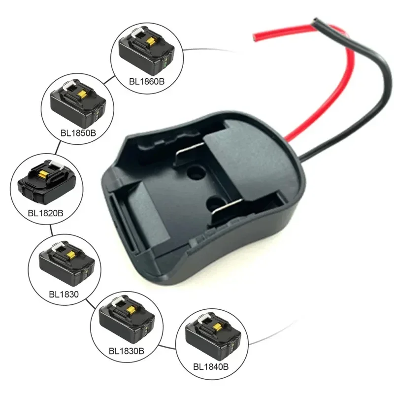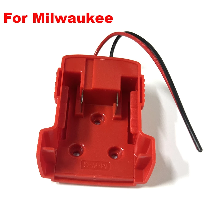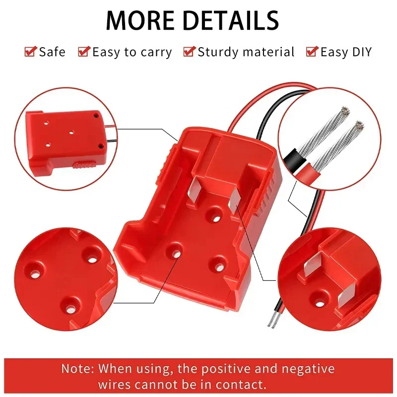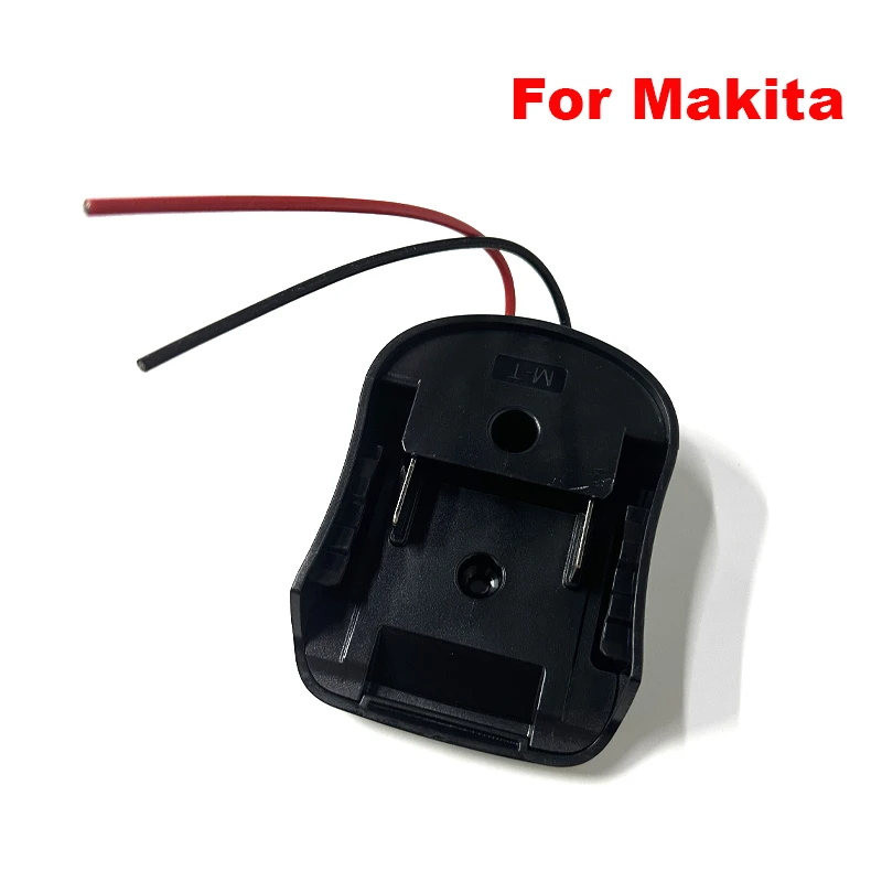Adaptador de batería para Makita/Bosch/Milwaukee/Dewalt//Ryobi 18V 20V batería de iones de litio DIY adaptador de rueda eléctrica soporte de base Característica: * Fijación con orificios para tornillos: el adaptador se puede fijar en cualquier posición para facilitar la organización. * Puede proporcionar alimentación CC de 18 V y 20 V para las herramientas.(Como coches de juguete, luces LED, diversas herramientas). * Especificación del cable: resistente a altas temperaturas 14AWG. * El cable negro y el cable rojo son cables de 14 AWG. Longitud de la línea de aproximadamente 12-15 cm. * Adecuado para aplicaciones de alta potencia. * Al usarlo, preste atención a que los cables negros y los cables rojos no se toquen entre sí para evitar cortocircuitos.