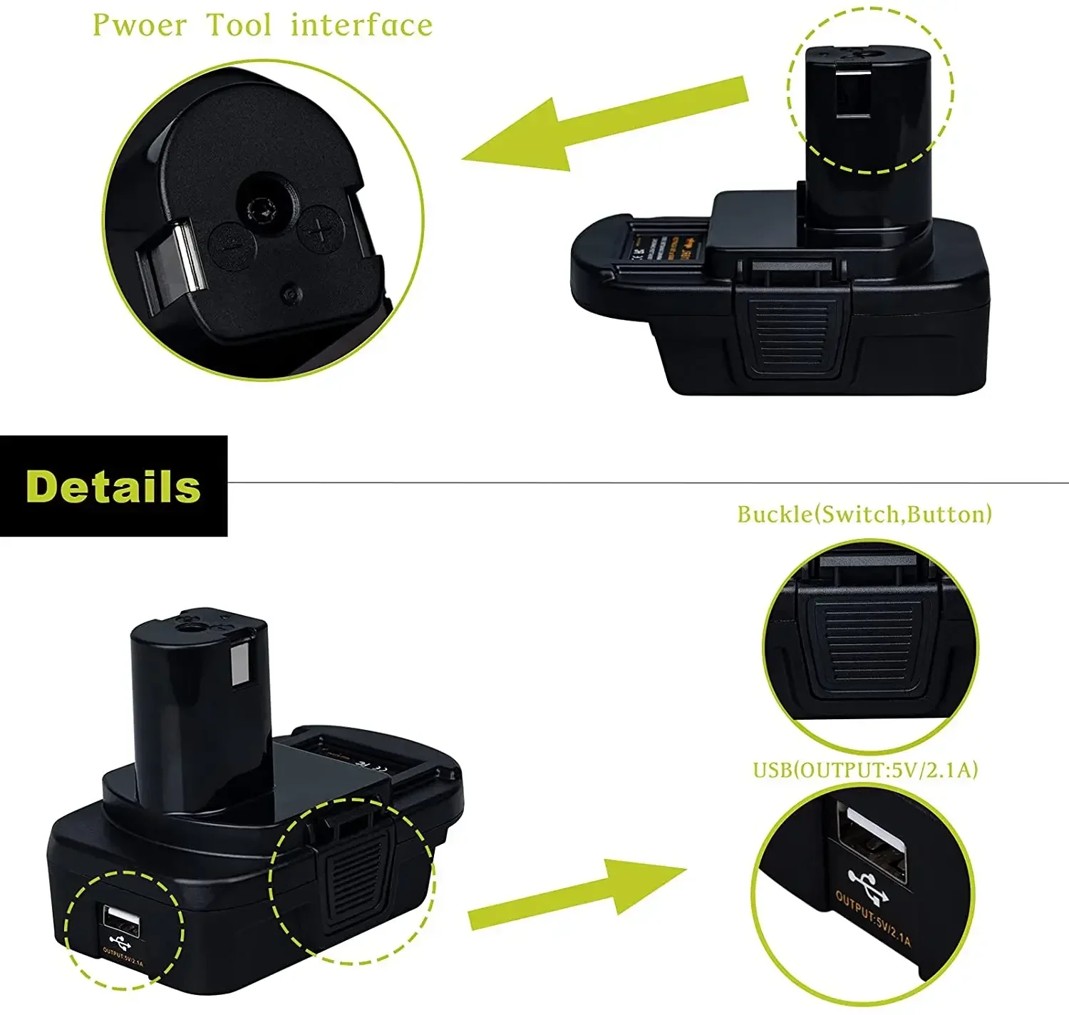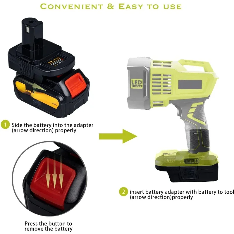 【Función del producto】Este adaptador puede hacer que las baterías de litio enumeradas se utilicen para herramientas Ryobi de 18 V y le permite disfrutar de los beneficios del tiempo de funcionamiento prolongado de las baterías de iones de litio en sus herramientas de 18 V existentes.