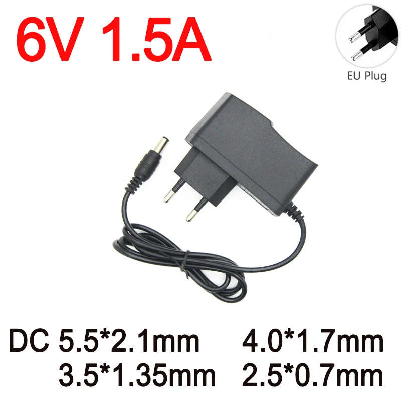 Parámetros de red y otras instrucciones Fuente de alimentación universal, transformador de potencia de conmutación El voltaje de suministro está dentro del rango apropiado de necesidades de 6V, consumo de energía en el dispositivo 1.5a o 1.5a Fuente de alimentación de CC de los requisitos eléctricos 6v1.5a Placa de desarrollo, disco duro móvil, etc. aplicado El voltaje de suministro es adecuado para todo tipo de necesidades 6V 1.5A o 1.5A siguiendo los productos de entrada de corriente CC, ¡sin operación de sobrecarga! Atención selectiva de potencia a seguir en línea para seleccionar el voltaje y la corriente que es igual o mayor que la potencia eléctrica requerida para alimentar Voltaje de entrada (ENTRADA): 100-240V 50-60Hz El voltaje de salida (salida): DC 6V-1.5A Potencia (salida máxima): 9W Forma: como las siguientes imágenes son mapa físico longitud 1 m Polaridad: en el interior está el polo positivo; en el exterior está el polo negativo. Enchufe: 5,5*2,1mm, 4,0*1,7mm, 3,5*1,35mm, 2,5*0,7mm Tarjeta física de adaptador de corriente Para otros tipos de electricidad es necesario ponerse en contacto con el propietario
