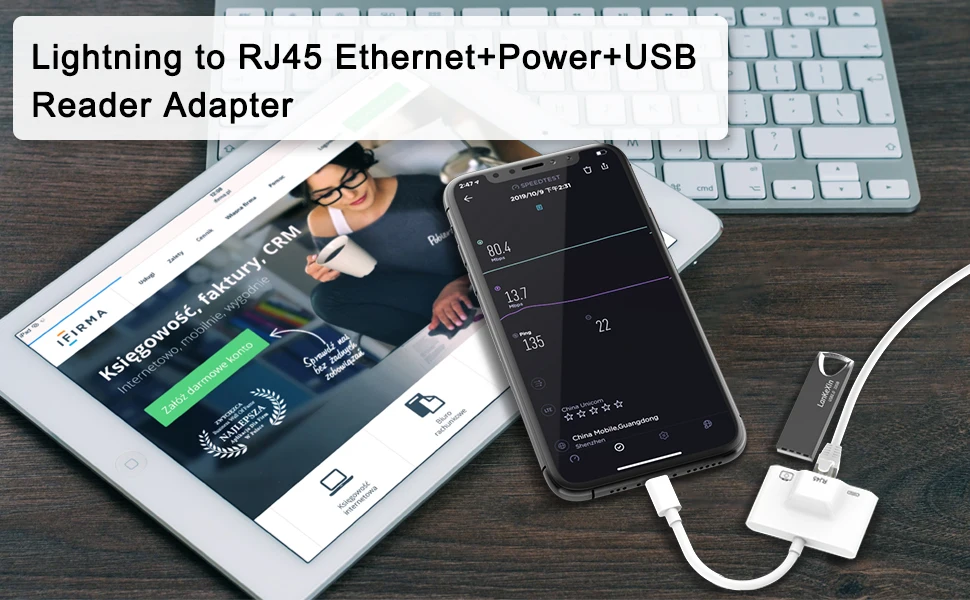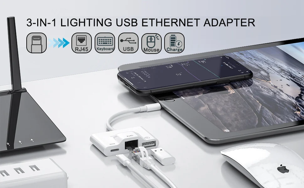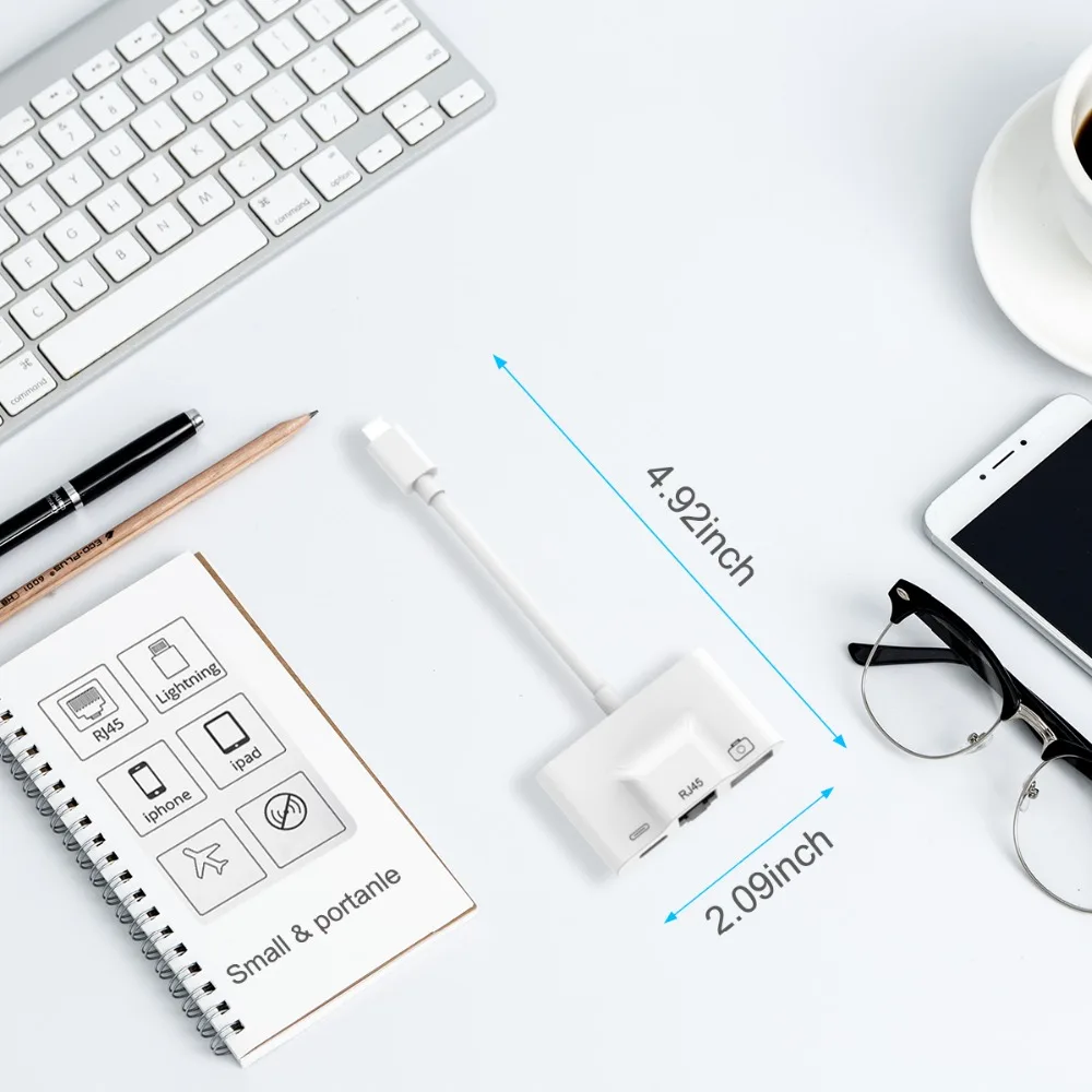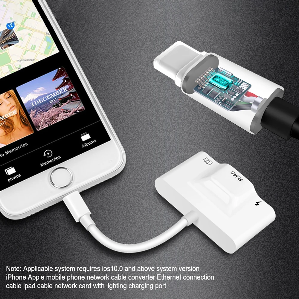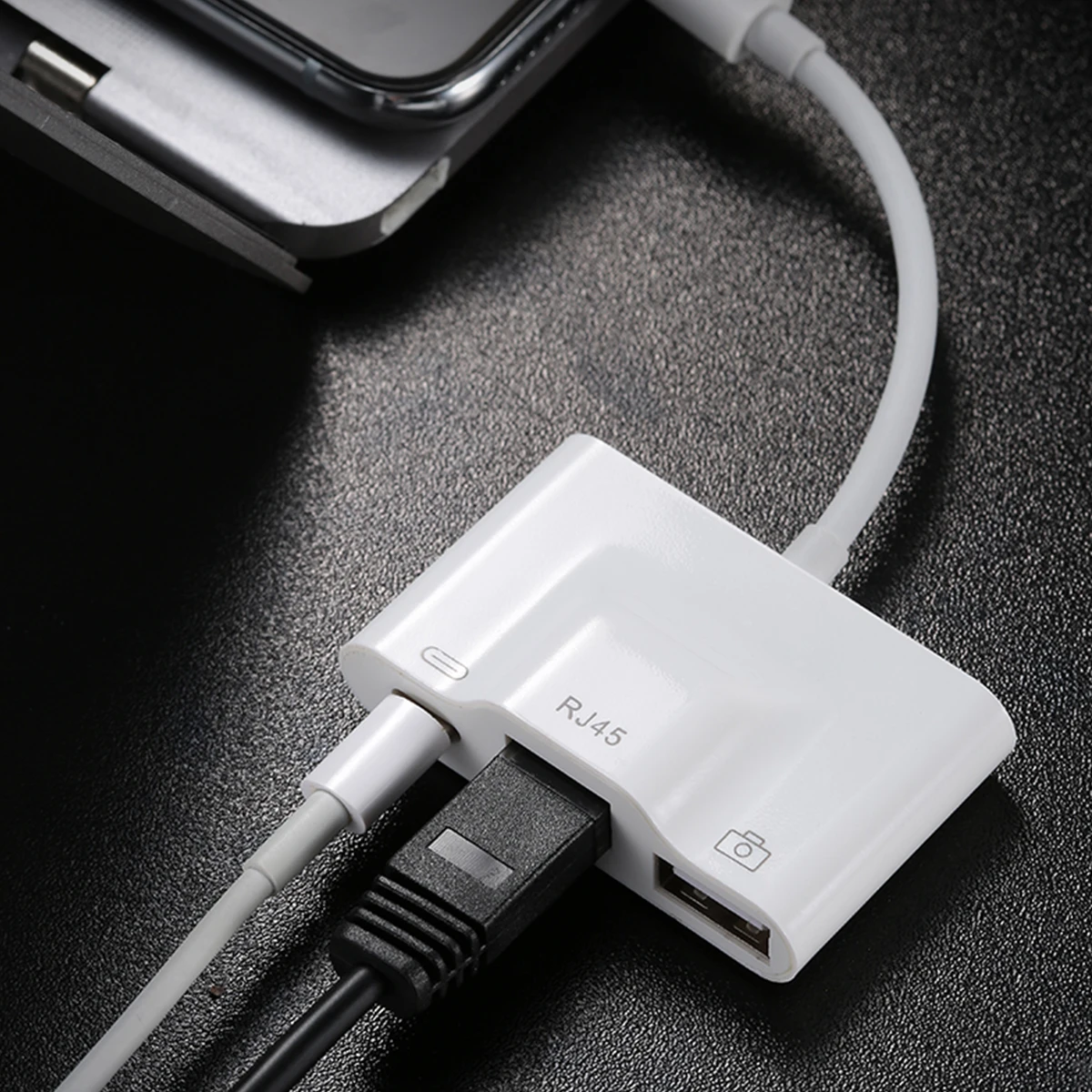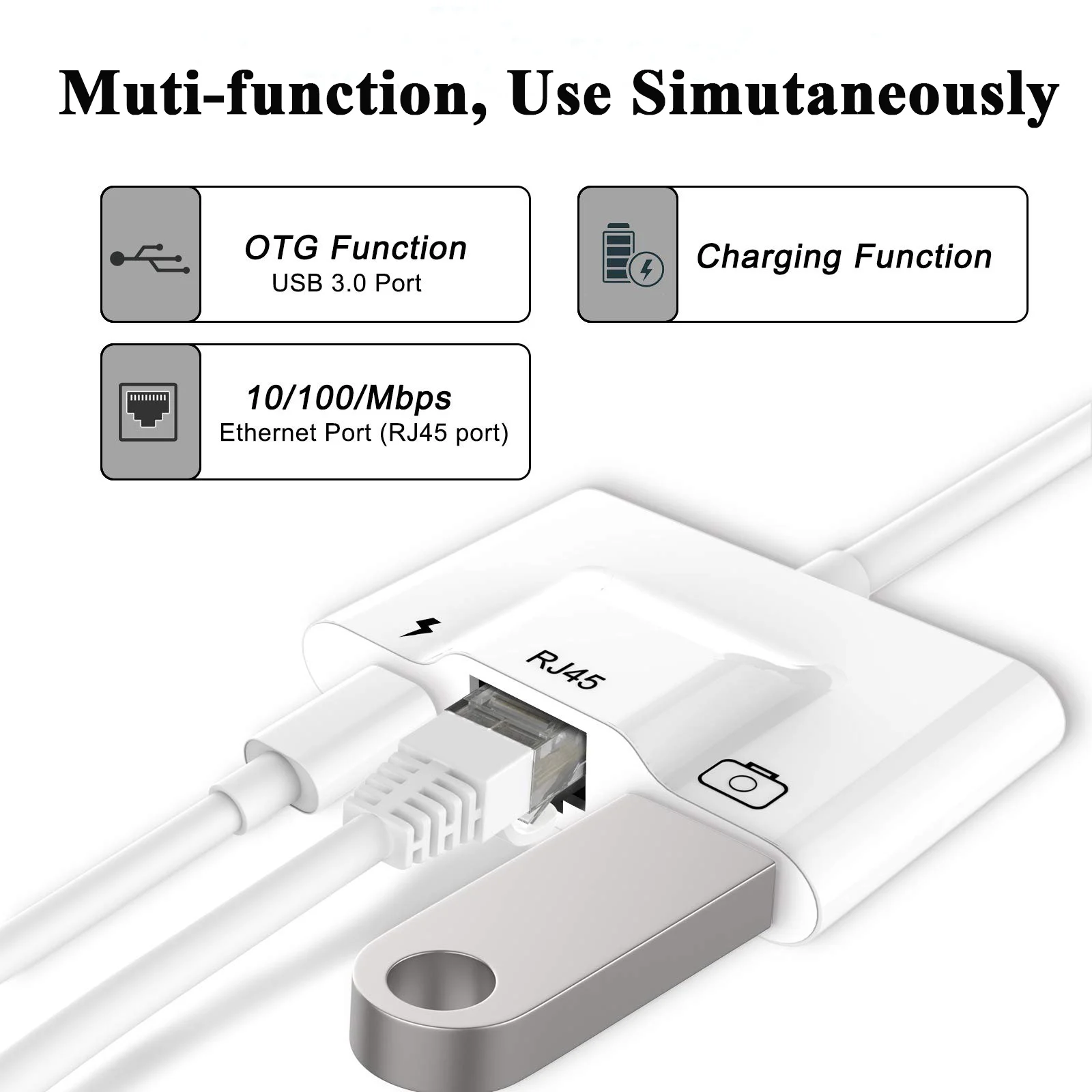 Cable de red iOS RJ45 Ethernet LAN con cable + lector de cámara USB 3 + carga iOS a iPhone/iPad. Admite navegar por Internet y cargar al mismo tiempo.
