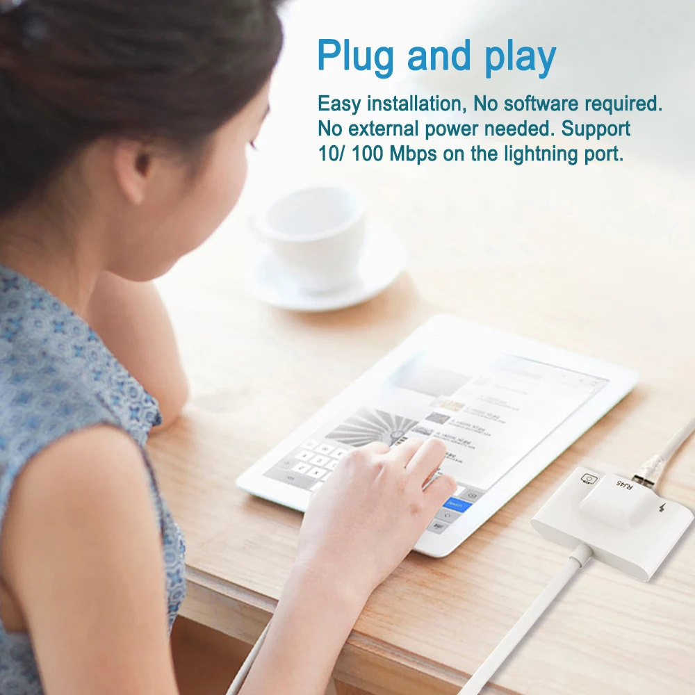 Este adaptador Ethernet para iPhone admite una transmisión rápida a Internet de hasta 100Mbps de red Ethernet por cable. Consiga acceso a la red por cable, resuelva el problema de la inestabilidad del WiFi, Vea vídeos y juegue a juegos con estabilidad en línea.