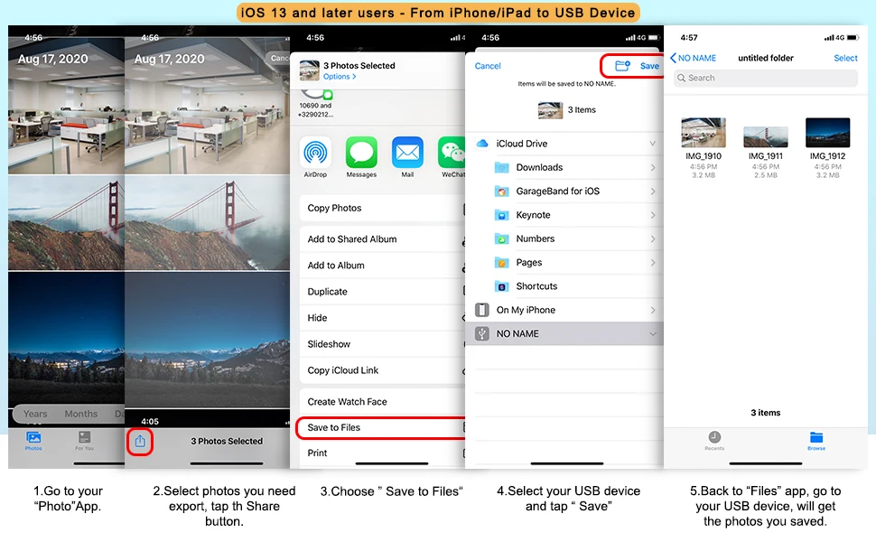 Lector de cámara USB 3,0 compatible con velocidad de transferencia de datos rápida de hasta 60 MB/S-90 MB/S.iOS 13 y posteriores, admite transmisión bidireccional (incluye imágenes/videos,Word,Excel,PDF, etc.),iOS 12 y anteriores, solo transmisión unidireccional a su iPhone/iPad.