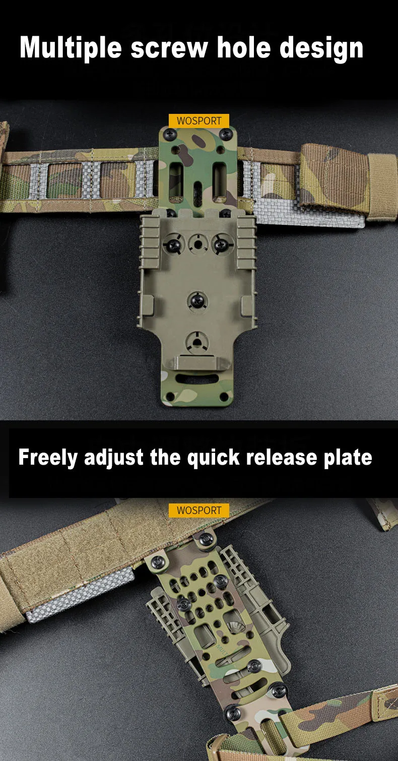 Es compatible con el popular modo de transporte "Mid-ride" para bajar la pistola por debajo de la línea del cinturón del tirador, lo que permite que su sistema de fundas elimine la armadura corporal y las bolsas. Este adaptador se adapta a todas las fundas de tipo patrón de "tres agujeros" y otras marcas de fundas que utilizan este método probado de fijación. También admite el uso de muchos sistemas de funda de separación rápida de uso común.