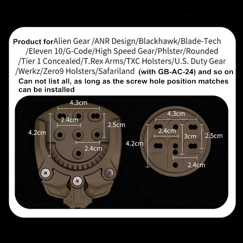 Producto para: Alien Gear/Diseño ANR/Blackhawk/Blade-Tech/Eleven 10/Code G/Engranaje de alta velocidad/Phlster/Arredondado/Tier 1 oculto/Brazos T.Rex/Fundas TXC/U.S.Duty GearWerkz/Zero9 Coldres/Safariland (con GB-AC-24) y así sucesivamente No puedo enumerar todos, siempre y cuando se pueda instalar la posición del orificio del tornillo.