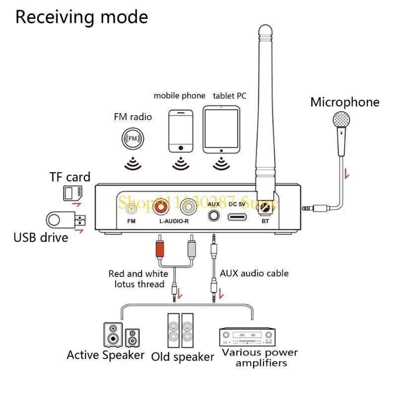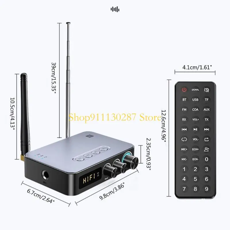 Dispositivos compatibles: todo tipo de parlantes, computadora de escritorio, computadora portátil, amplificador de potencia, proyector Antena de radio FM mejorada, búsqueda automática/manual de estaciones de almacenamiento y con control remoto