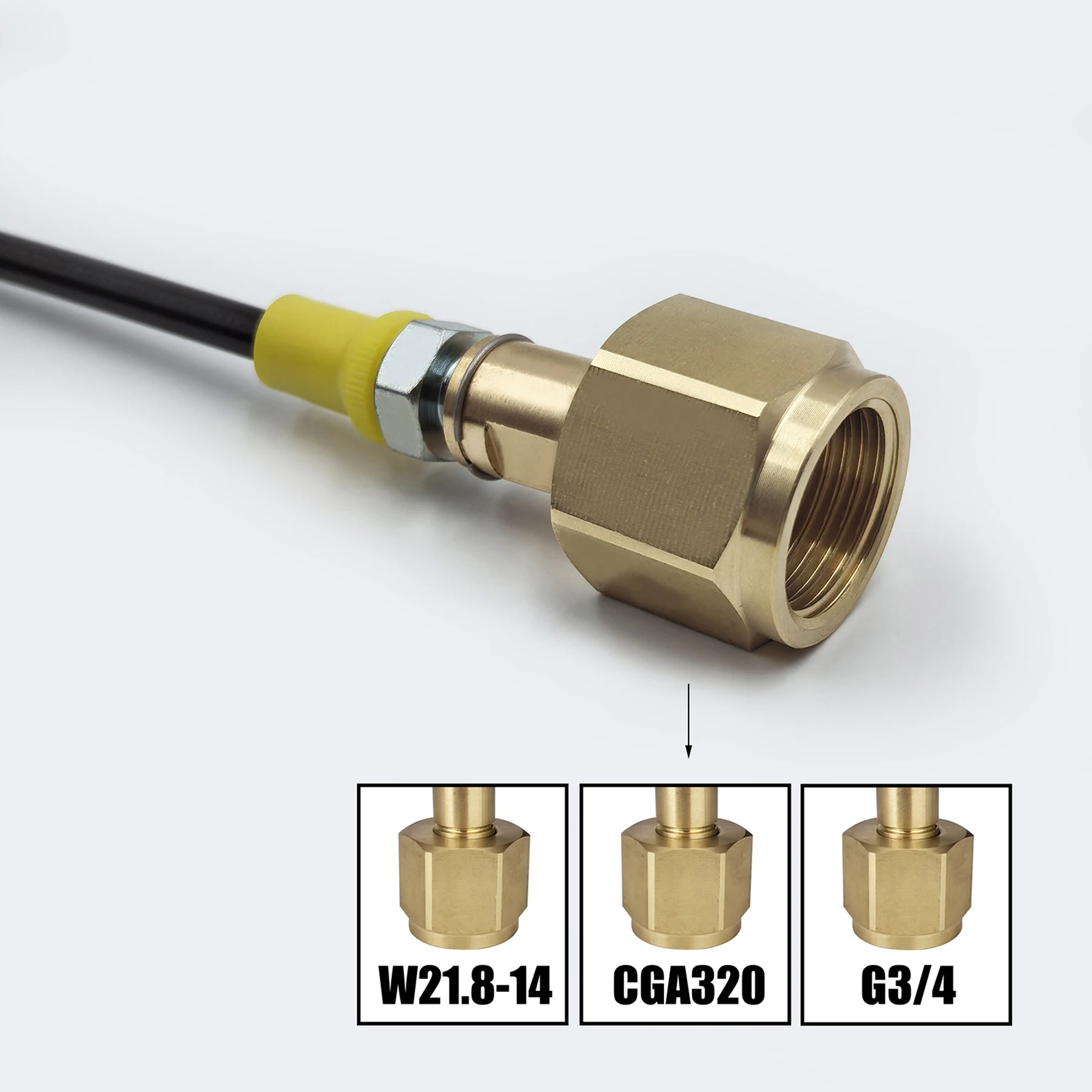 2.Conector de tanque de alta resistencia, la rosca es W21.8, CGA320 o G3/4.Con manómetro de doble rango de 150bar/2000psi.Fácil instalación con la llave incluida.