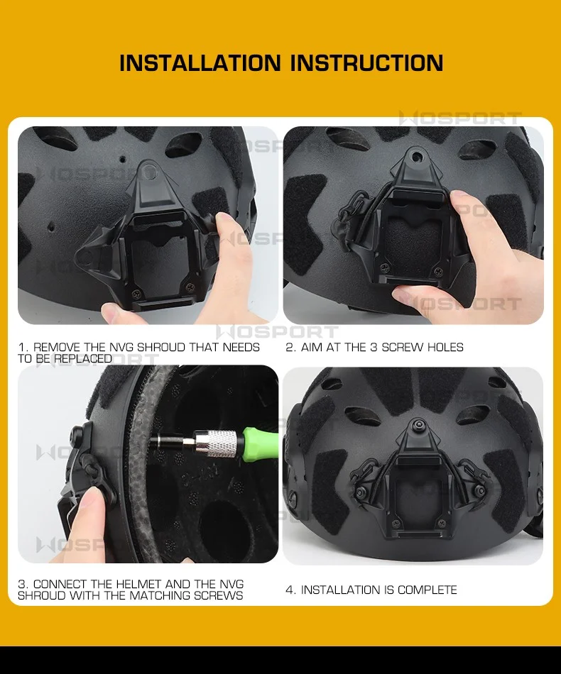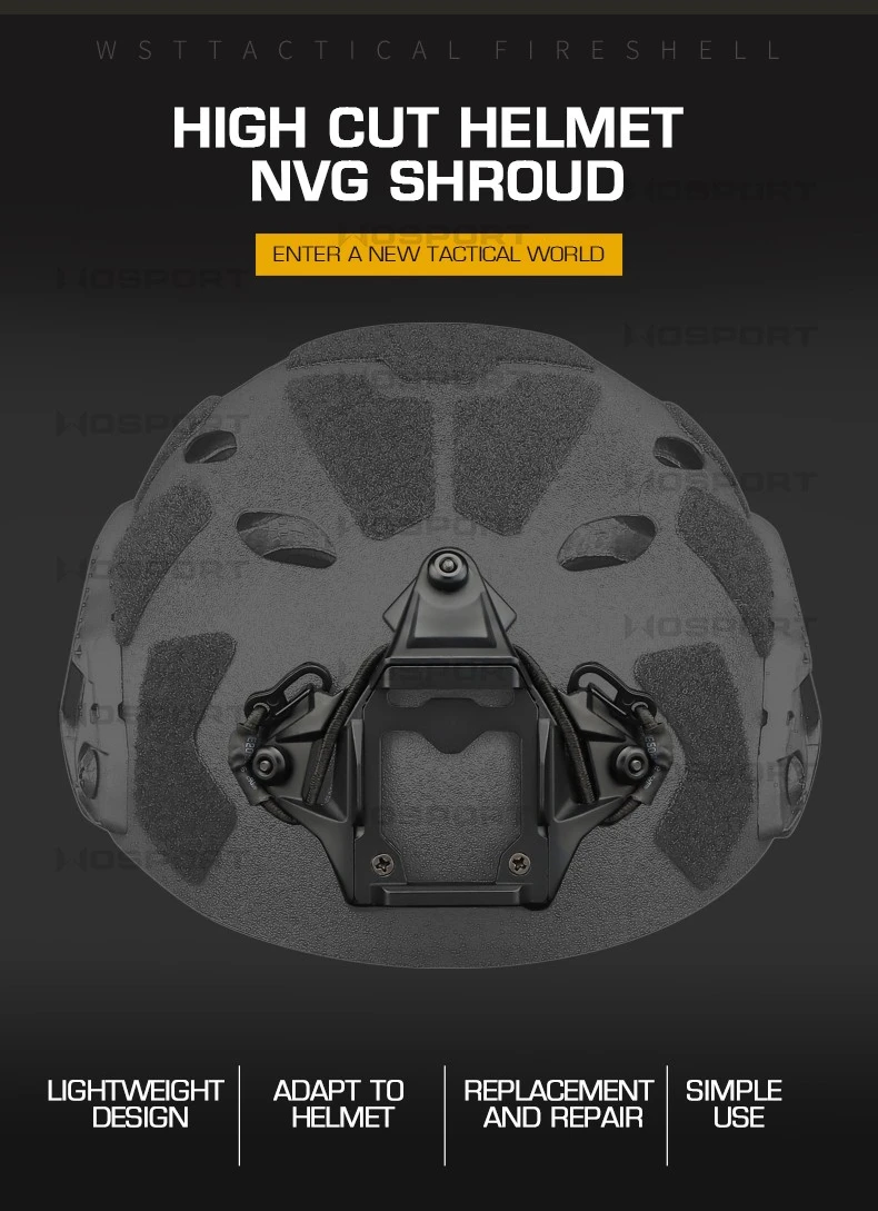 Característica: Fabricado en plástico, duradero y práctico. Ligero y portátil, fácil de transportar. Adecuado para cascos de combate FAST, cámara. Incluye tornillos que se utilizan para instalar la base de montaje en el casco. El soporte para casco es muy fácil de instalar.