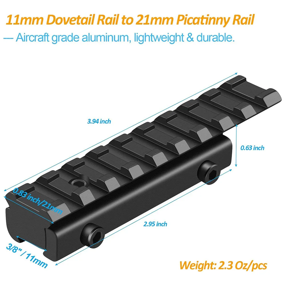 2.Convierta cola de milano de 11 mm en riel Picatinny de 21 mm: 2,94 pulgadas de largo en la base, el riel Picatinny se extiende 3,94 pulgadas lo que permite una colocación de óptica más flexible.