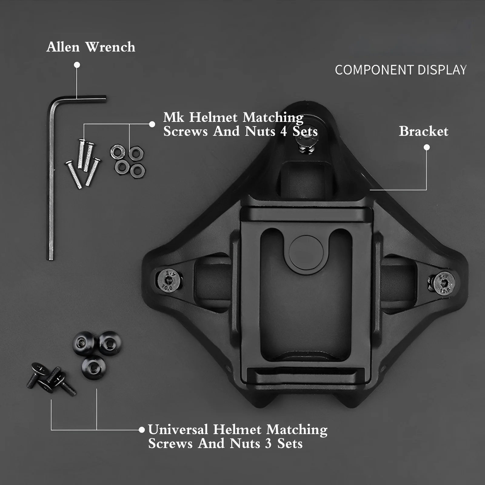 La cubierta de 3 orificios utiliza una interfaz de montaje de aluminio mecanizado/anodizado para la mayoría de los NVG. También se puede utilizar para conectar faros o cámaras digitales utilizando adaptadores de montaje de casco compatibles.