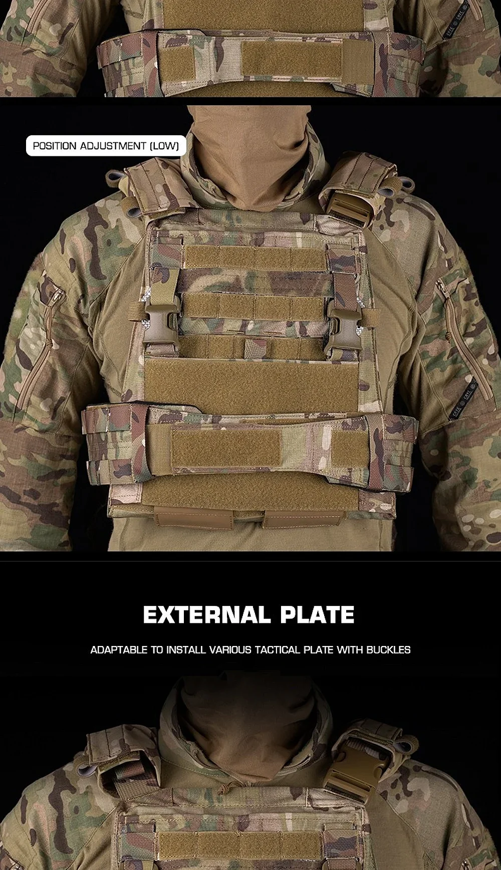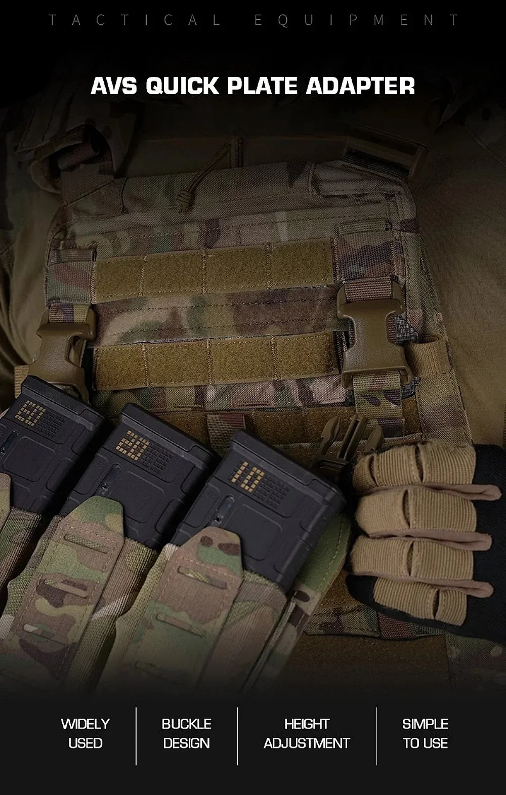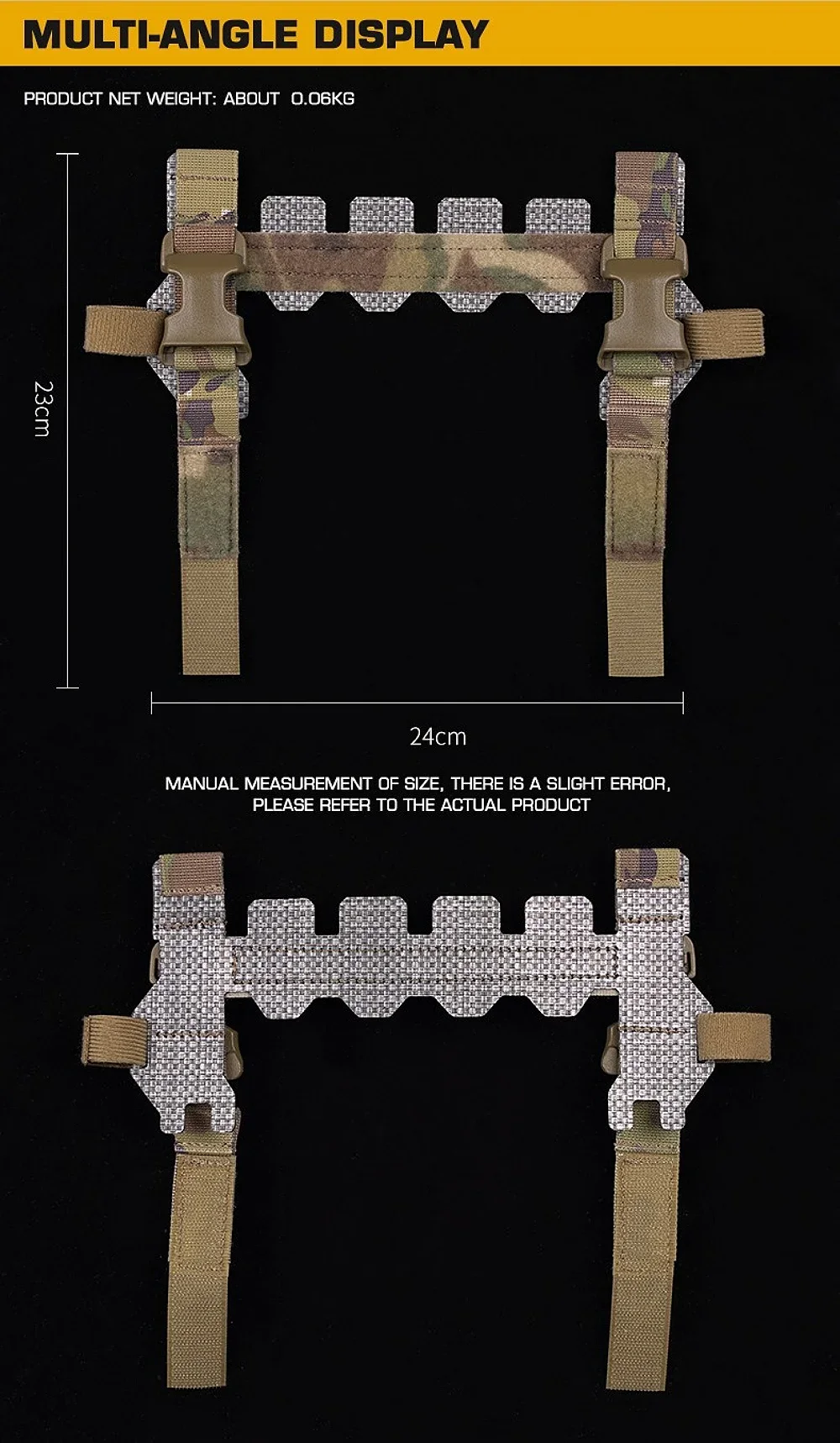 ●Este producto es compatible con chalecos tácticos AVS MBAV/Standard o sistemas MOLLE con 5 filas y 6 columnas.Se puede utilizar con la mayoría de los aparejos de pecho tácticos y paneles frontales con hebillas o gancho en G.Además, la hebilla se puede quitar y reemplazar con un gancho G si se desea.