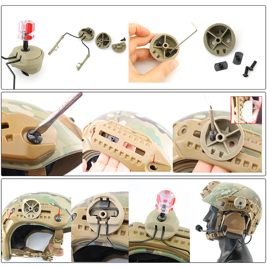 The tactical headset is installed on the helmet using this product. When not in use, the headset can be rotated to the back of the helmet, which simplifies the storage method and creates a very low-key appearance.