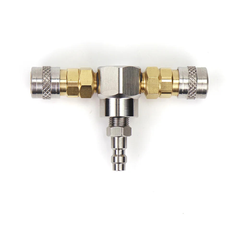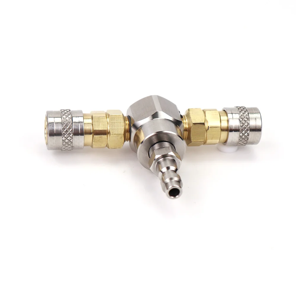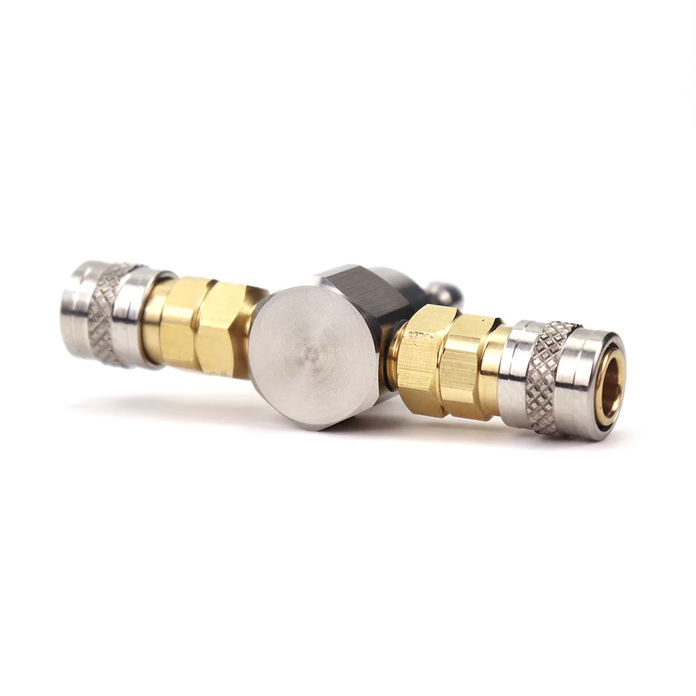 Accesorio QD de latón doble para conectar dos pistolas separadas a un tanque y regulador.Permite cambiar rápidamente sus pistolas HPA.