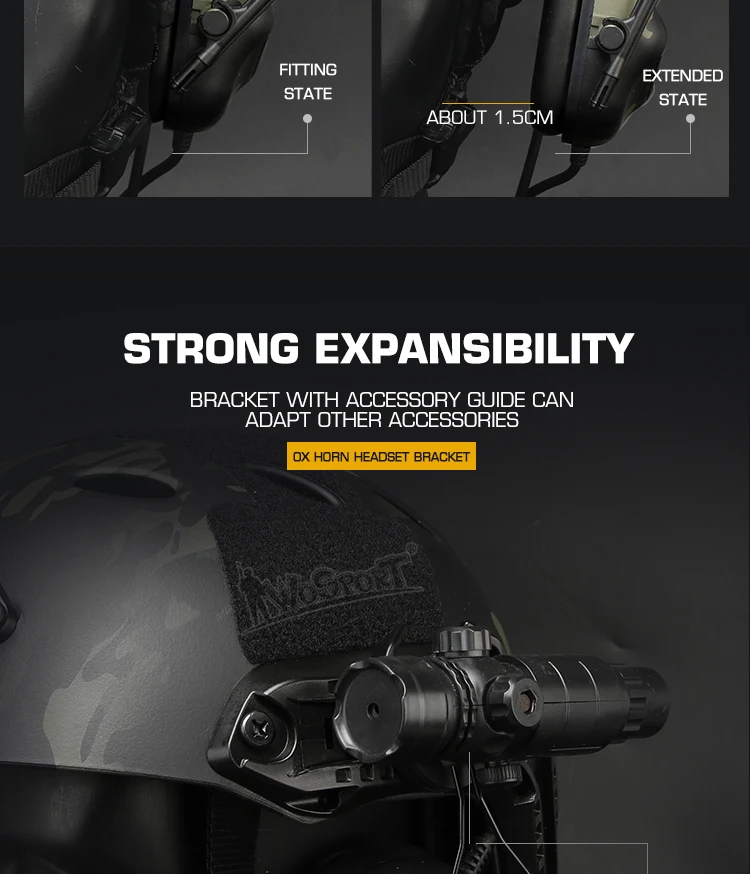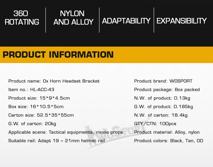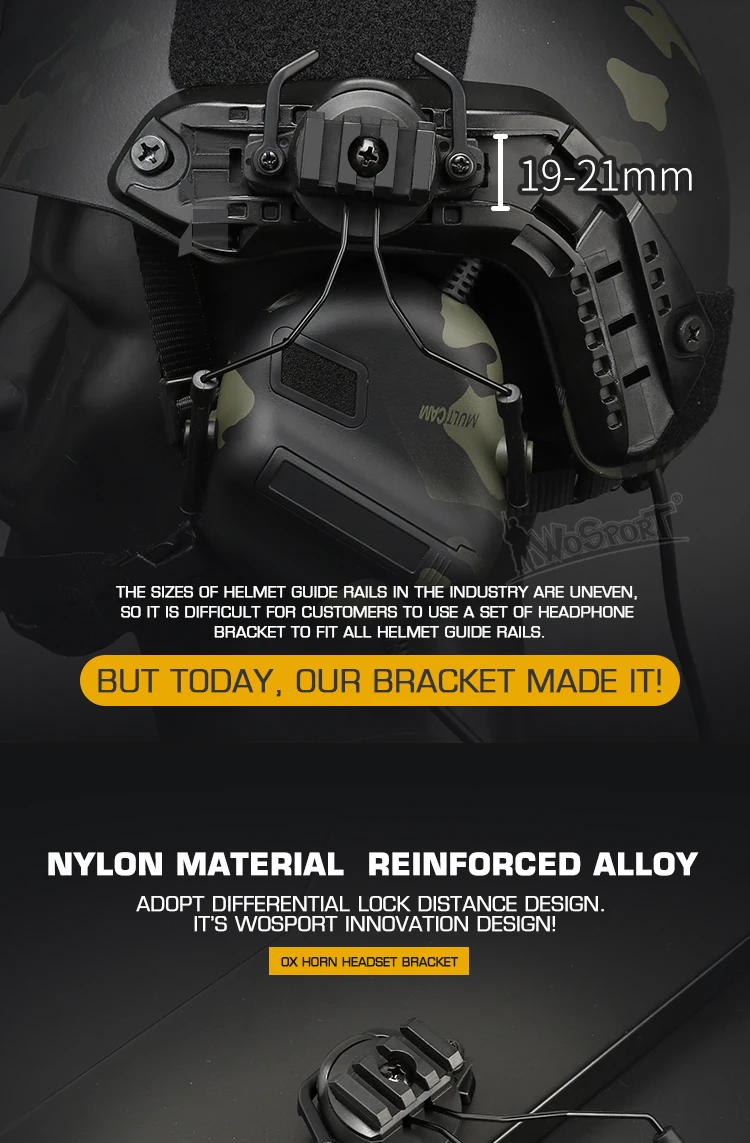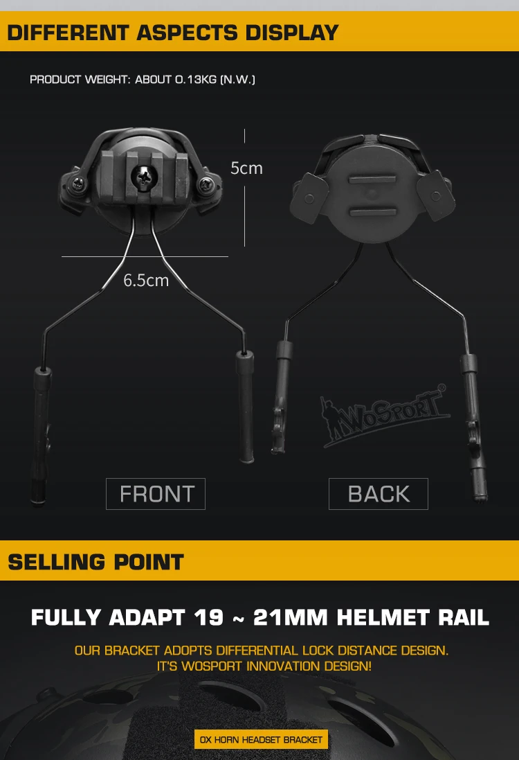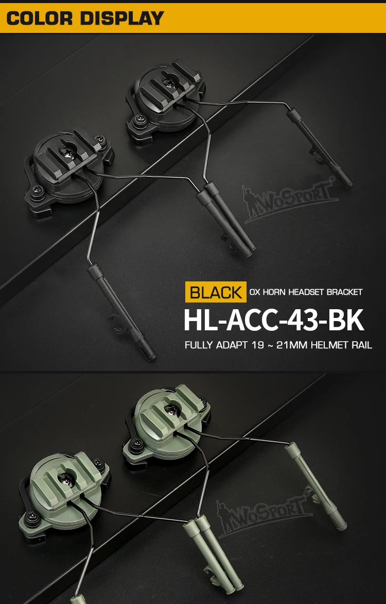 Soporte para auriculares para casco Soporte ajustable para auriculares de cuerno de buey para accesorio de casco RÁPIDOInformación del producto Nombre del producto: Auricular Soporte Artículo No.: HL-ACC-43 Tamaño del producto: 15*9*4,5 cm Tamaño de la caja: 16*10,5*5cm Escena aplicable: equipos CS, accesorios de películas. Riel adecuado: adapte el riel del casco de 19 ~ 21 mm Paquete del producto: Caja empaquetada N.W.de producto: 0,13 kg Material del producto: aleación, nailon. Colores del producto: Negro, Bronceado, OD