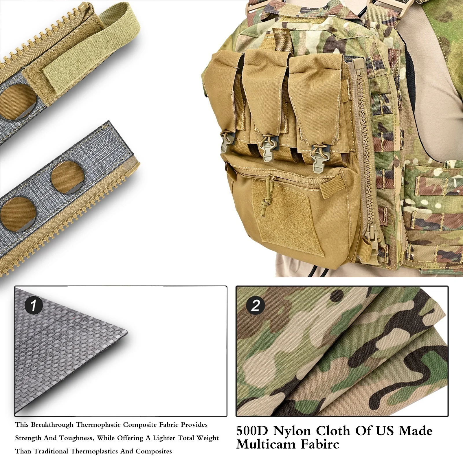 Utilice el sistema MOLLE para agregar cremalleras al chaleco sin cremalleras (por ejemplo, CPC, AVS, JPC) para colocar fácil y rápidamente mochilas con cremallera, bolsas de hidratación, bolsas de supermercado y más.