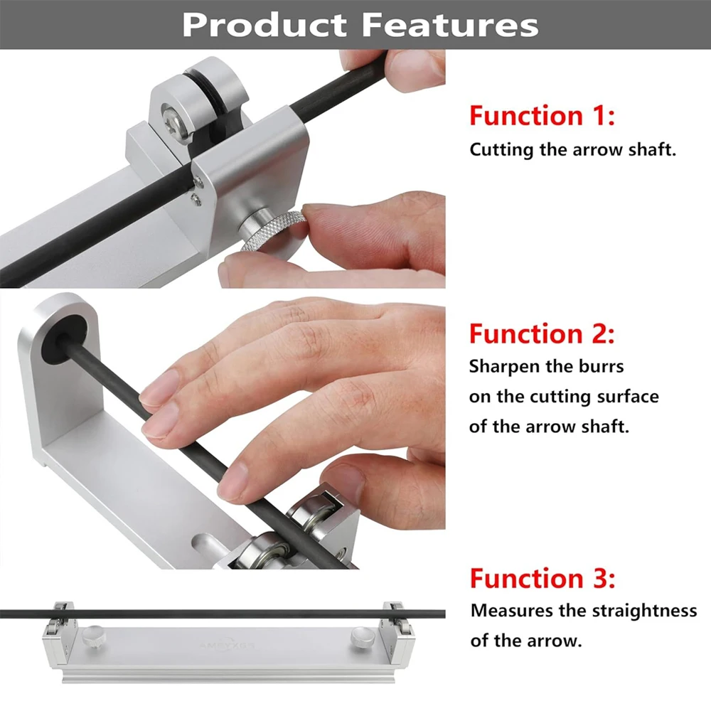 1.Herramienta de flecha multifuncional.Para comprobar la rectitud de las flechas, cortar flechas y pulir las flechas.