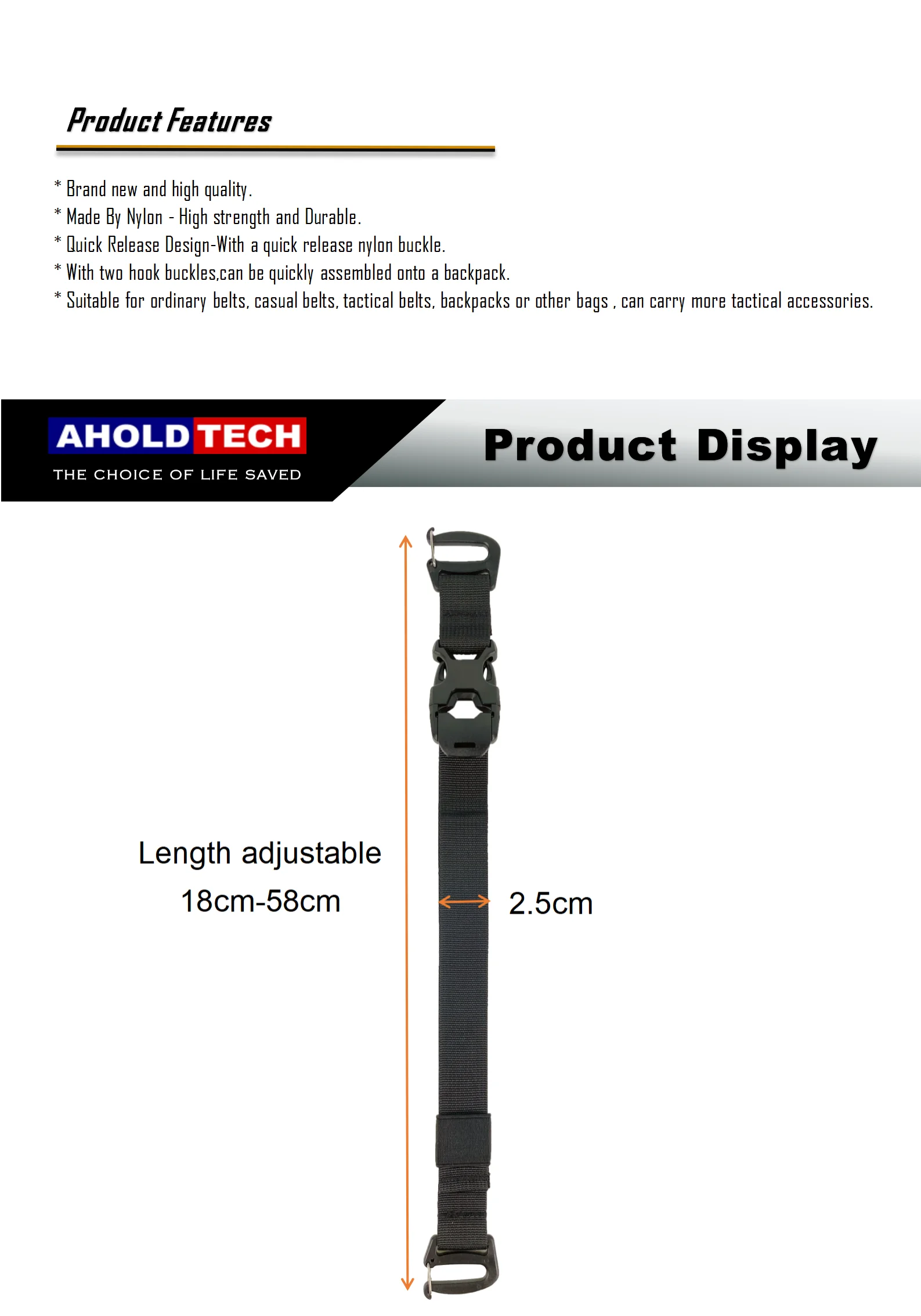 * Diseño de liberación rápida: con una hebilla de nylon de liberación rápida.