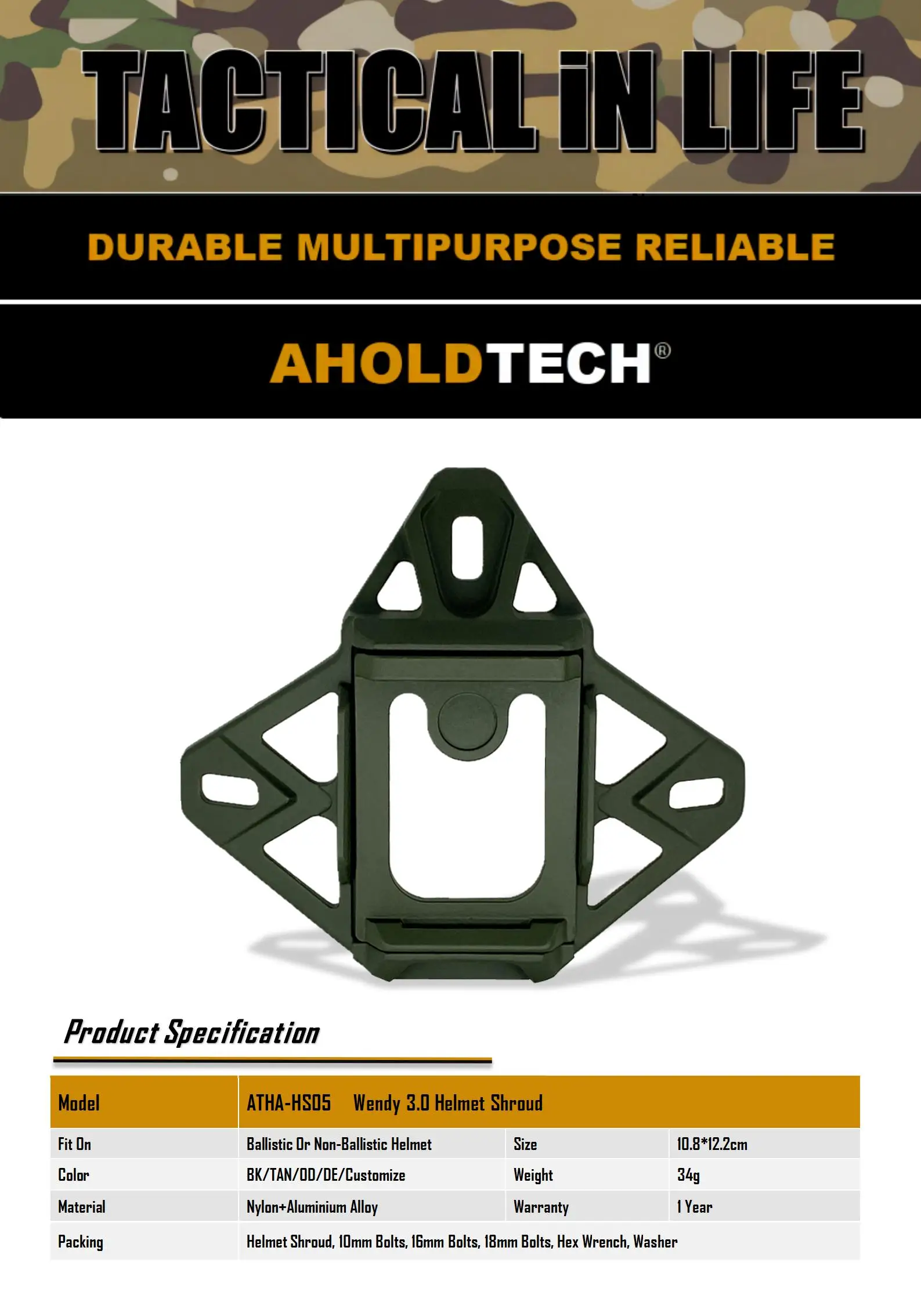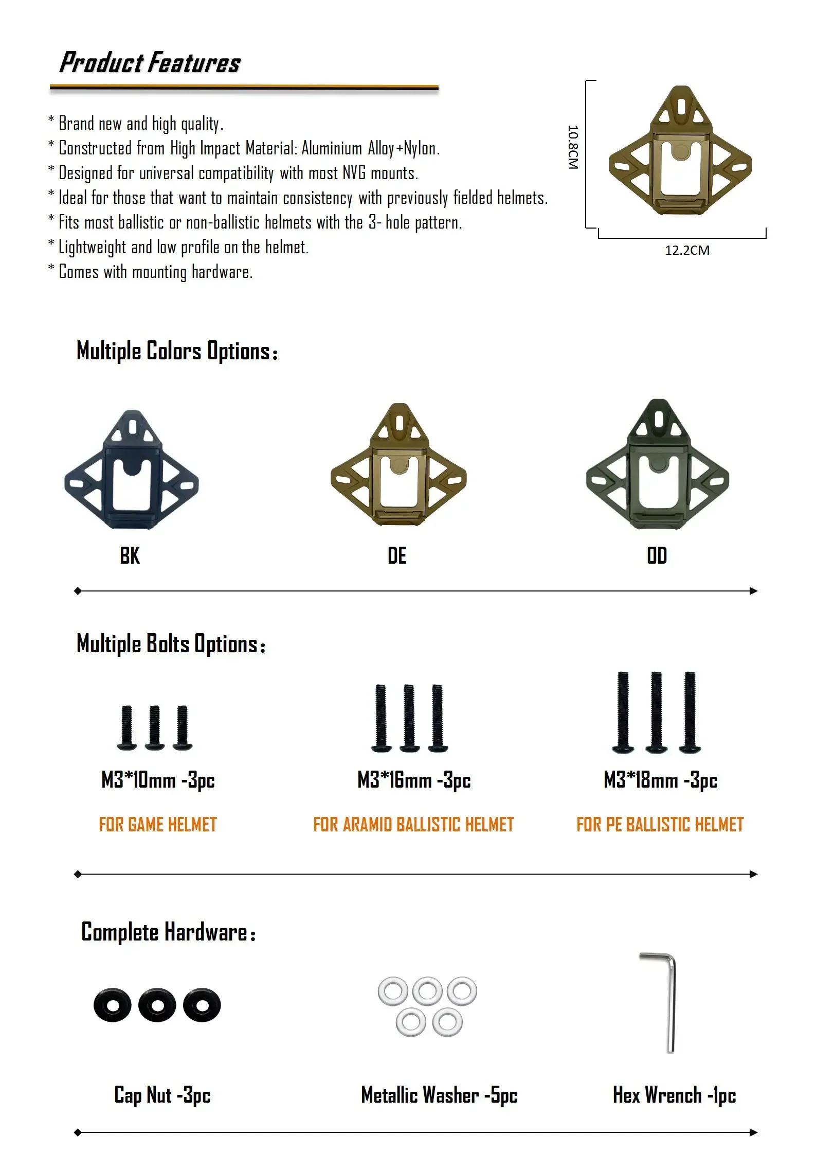* Se adapta a la mayoría de los cascos balísticos o no balísticos con el patrón de 3 agujeros.