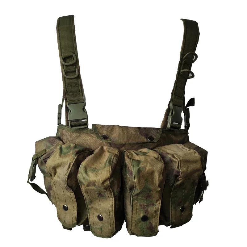 -4 bolsas para cargadores de rifle, cada bolsa puede contener hasta 2 cargadores tipo 7,62 (o 3 cargadores tipo 5,56) en forma de plátano