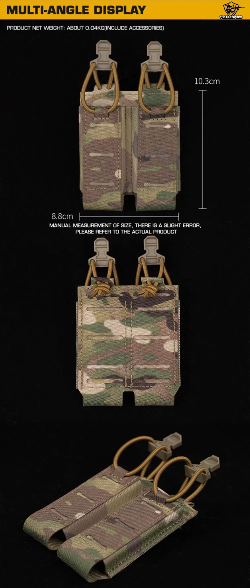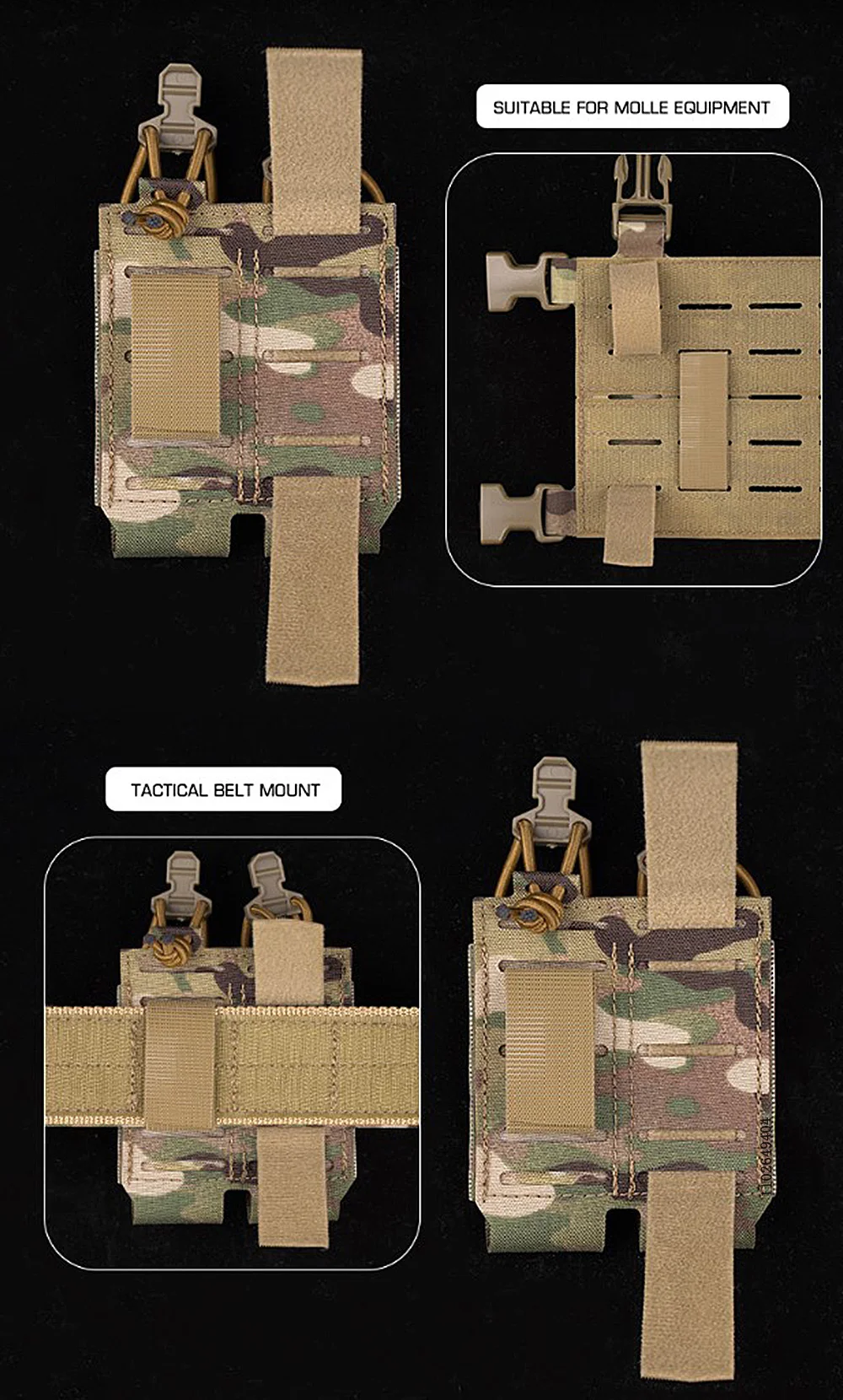 ✦ Equipado con dos correas de fijación de gancho y lazo, que se pueden instalar en equipos molle o cinturones tácticos