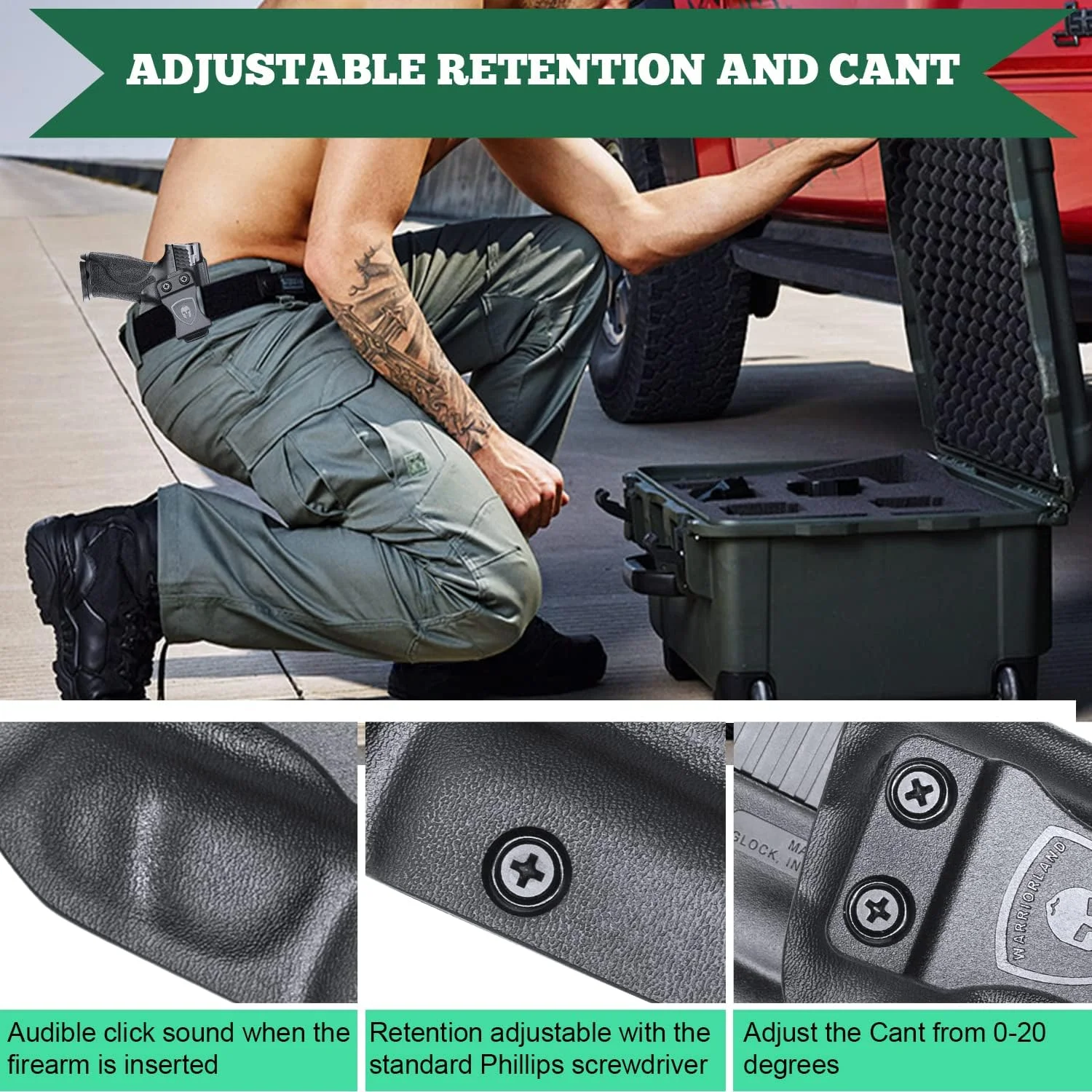 【Presión de retención ajustable y ajustable】 El ángulo de transporte (canto) se puede ajustar desde -5° a 20°, use un destornillador Phillips para personalizar el CANT para satisfacer sus necesidades, súper fácil para Appendix Carry, Hip Carry (reloj 3/9 en), transporte trasero (6 en punto).La tensión de retención también es ajustable, use un destornillador Phillips para alcanzar su presión de retención ideal
