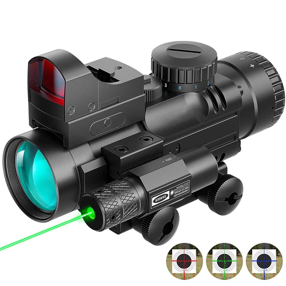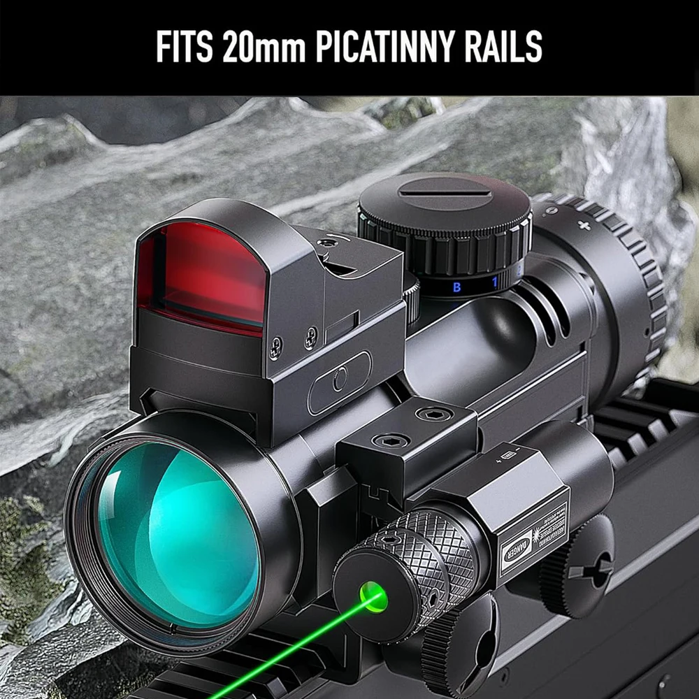 Alcance de rifle 4x32 con mira de punto rojo de 3 MOA y láser verde para rieles de 20 mm, pistolas largas, combinación de alcance de telémetro iluminado RGB