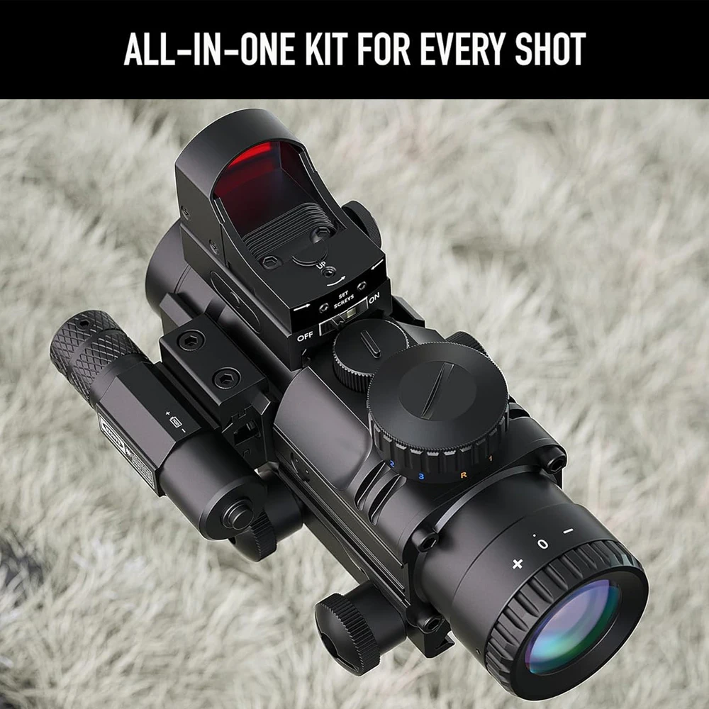 Nuestro visor de rifle 4x32 viene con una mira de punto rojo y un láser verde para satisfacer diversas necesidades de disparo en el campo, ya sea que sea un aficionado que se moje los pies o un hombre experimentado al aire libre que necesita un combo de visor de repuesto.