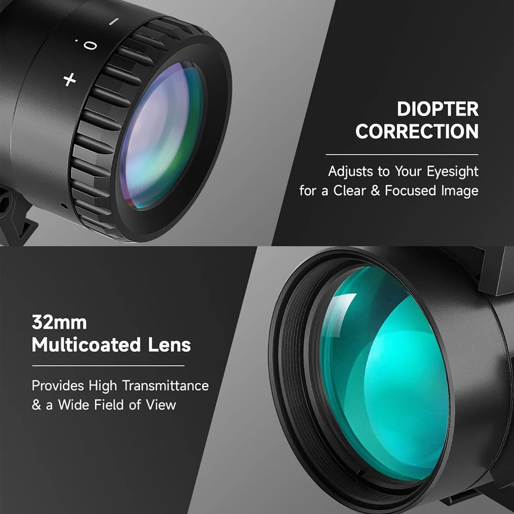 En comparación con las lentes azules comunes de la competencia, nuestras lentes verdes totalmente multicapa cuentan con alta transmitancia y claridad; Disfrute de un amplio campo de visión en cualquier entorno gracias a nuestro aumento de 4x y apertura de lente de 32 mm.