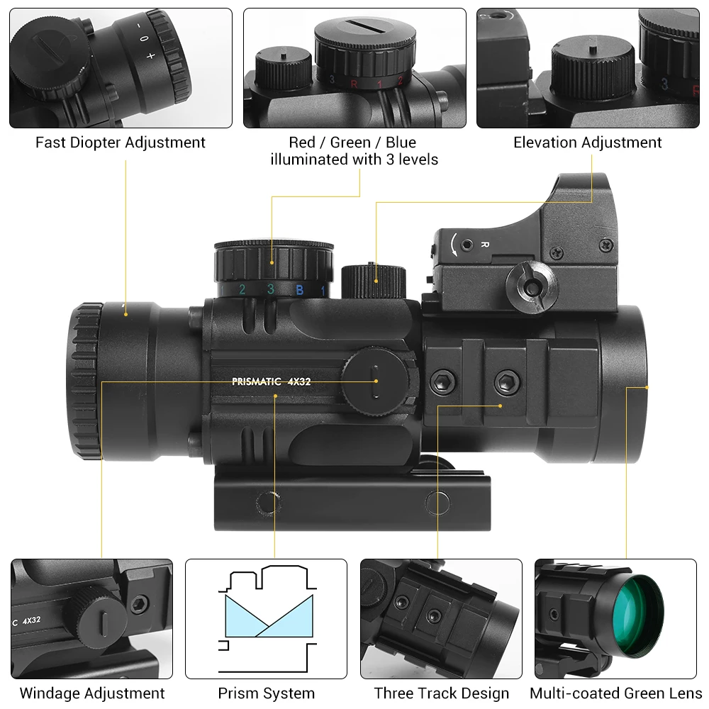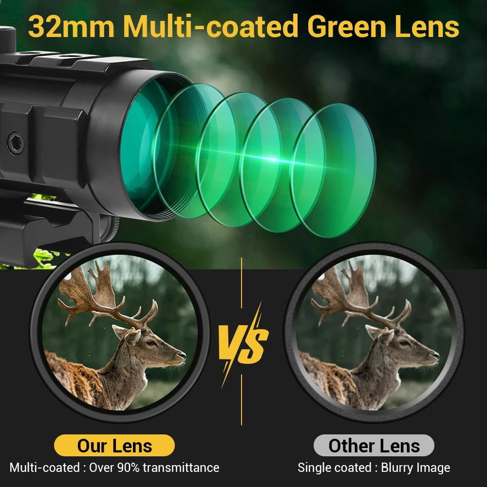 En comparación con las lentes azules comunes de la competencia, nuestras lentes verdes totalmente multicapa cuentan con alta transmitancia y claridad; Disfrute de un amplio campo de visión en cualquier entorno gracias a nuestro aumento de 4x y apertura de lente de 32 mm.
