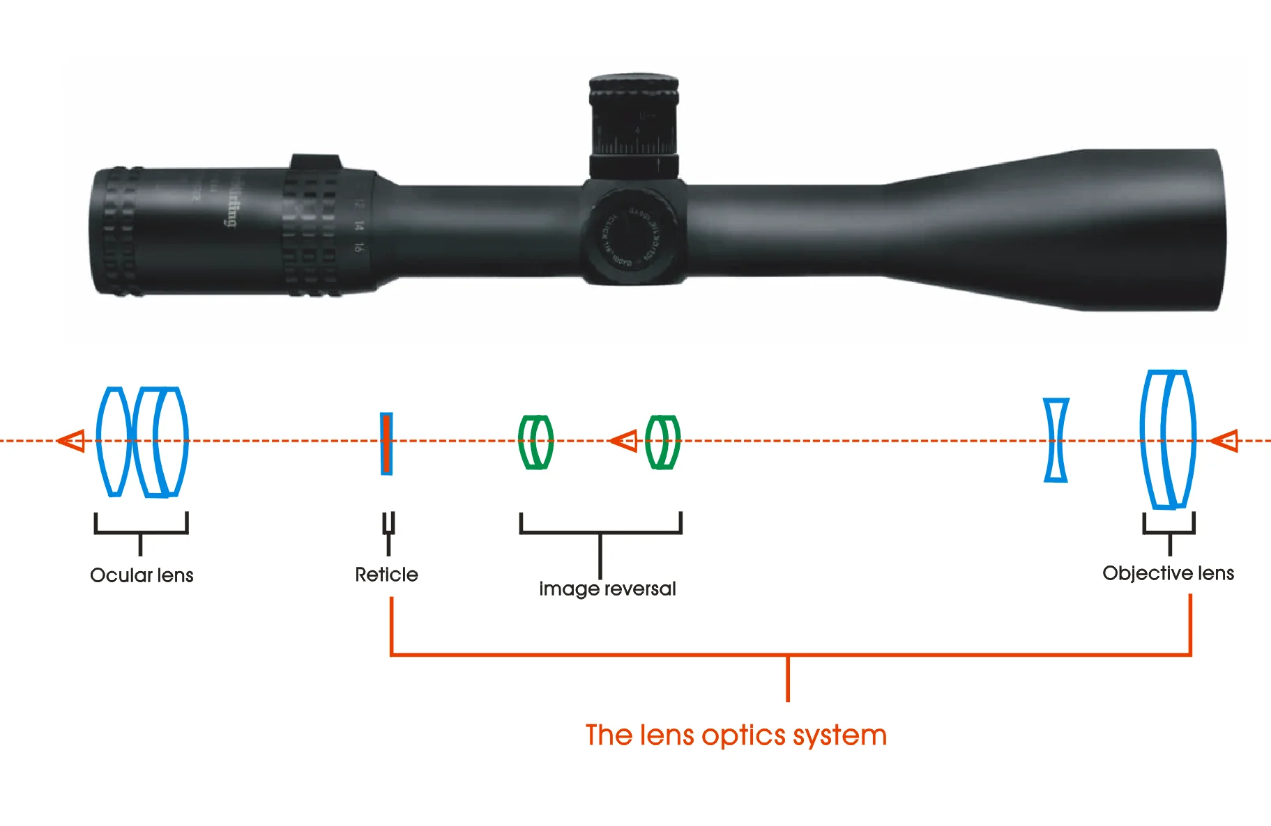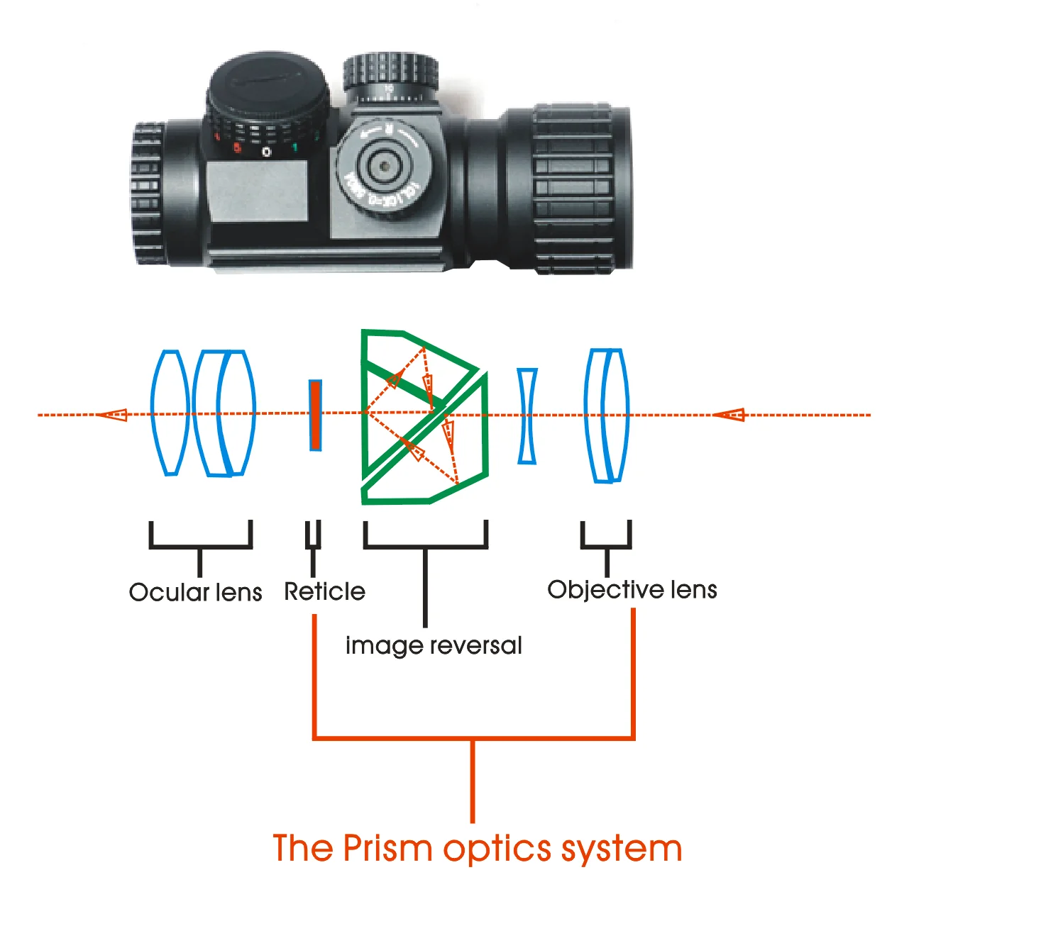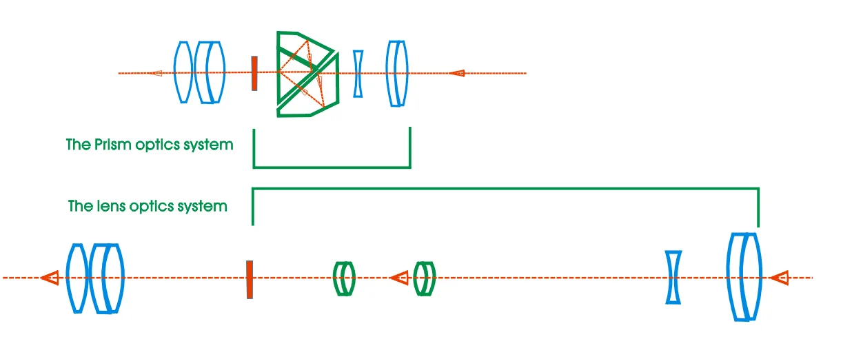 Como esta imagen, el sistema de prisma es obviamente más corto que el sistema de lentes.