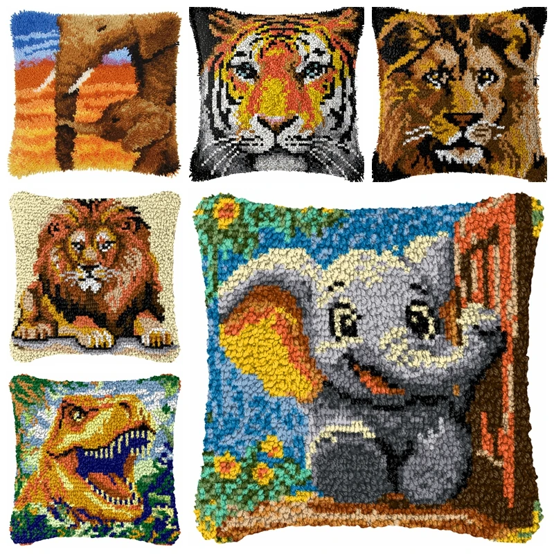 León dinosaurio elefante bordado alfombra lana gruesa tejido a mano punto de cruz pestillo gancho Kit alfombra Material cojín Knooppakket