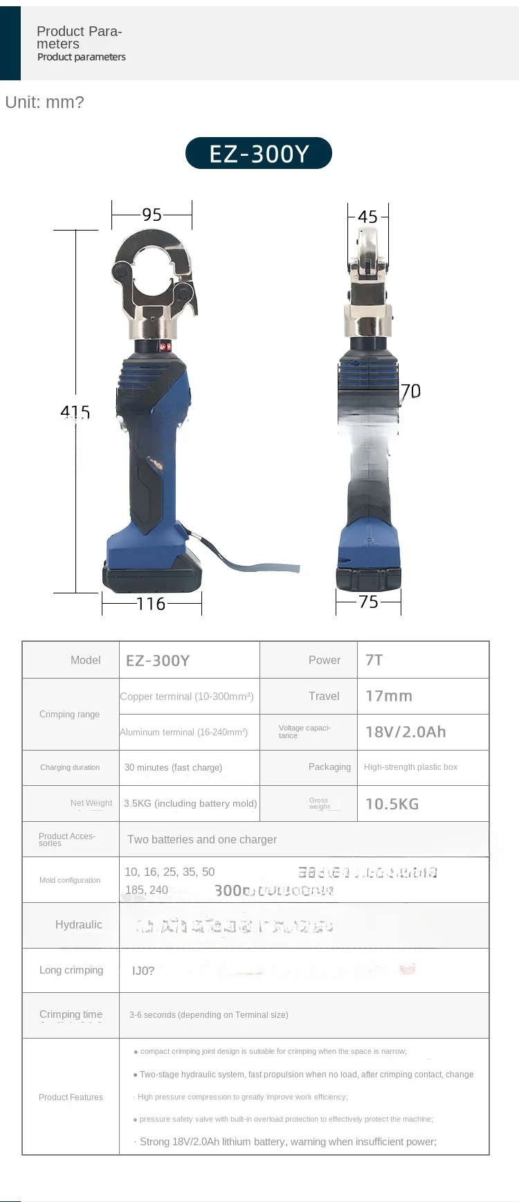 Alicates de prensado eléctricos, EZ-300Y, vástago recto, peso neto de 3,5 kg, presión 300, alicates hidráulicos inalámbricos