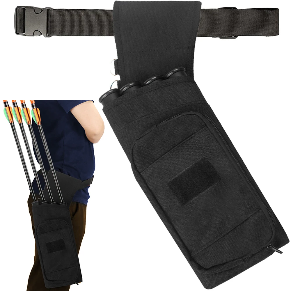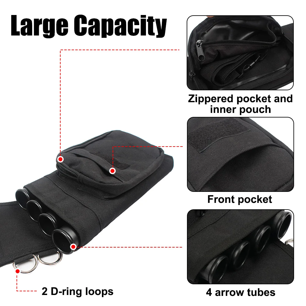 1. 【DISEÑO MULTIFUNCIONAL】 El carcaj de cadera para tiro con arco cuenta con 4 tubos de flechas, capacidad total para hasta 40 flechas, cada uno adecuado para flechas de hasta 27 pulgadas, acceso limpio y fácil.1 bolsillo con cremallera y 1 bolsillo sin cremallera para proteger objetos pequeños.2 anillos en D para artículos como botellas de agua.