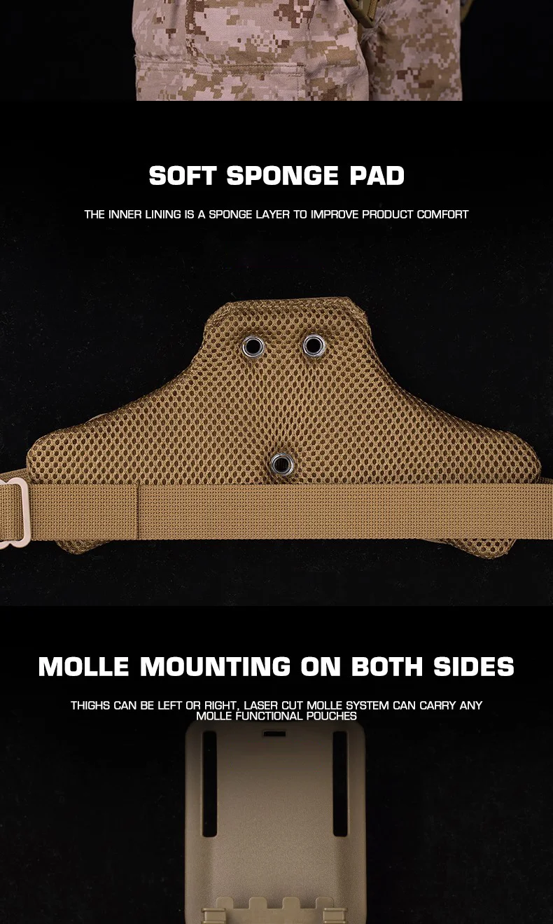 The Side Kick pad is designed to be compatible with holsters and adapters that utilize the 3-hole Safariland mounting system, making it a perfect fit for Safariland Low Ride UBL or True North Concepts MHA. This pad features Close Cell Foam and Spacer Mesh for cushioning and comfort, and includes two columns of MOLLE slots on each 'wing' for enhanced utility. Additionally, it comes with a 1" Thigh Strap equipped with a durable side release buckle and an elastic section for stretch and better fit.