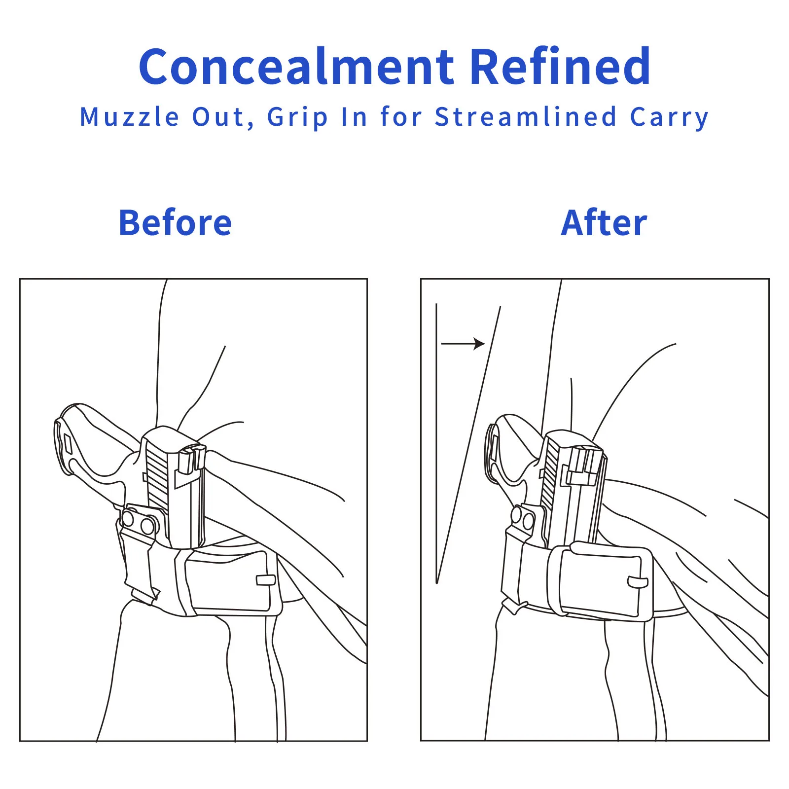 Transporte oculto durante todo el día con mayor comodidad.Los dientes del peine de silicona mejorados cuentan con un diseño de ventilación abierta, creando un canal de flujo de aire entre el cuerpo y la funda.Ideal para verano, ambientes con mucha humedad o uso prolongado.