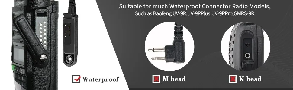 Aviso:Adecuado para muchos modelos de radio de conector impermeable, no adecuado para M-Head o K-Head Connector Radio