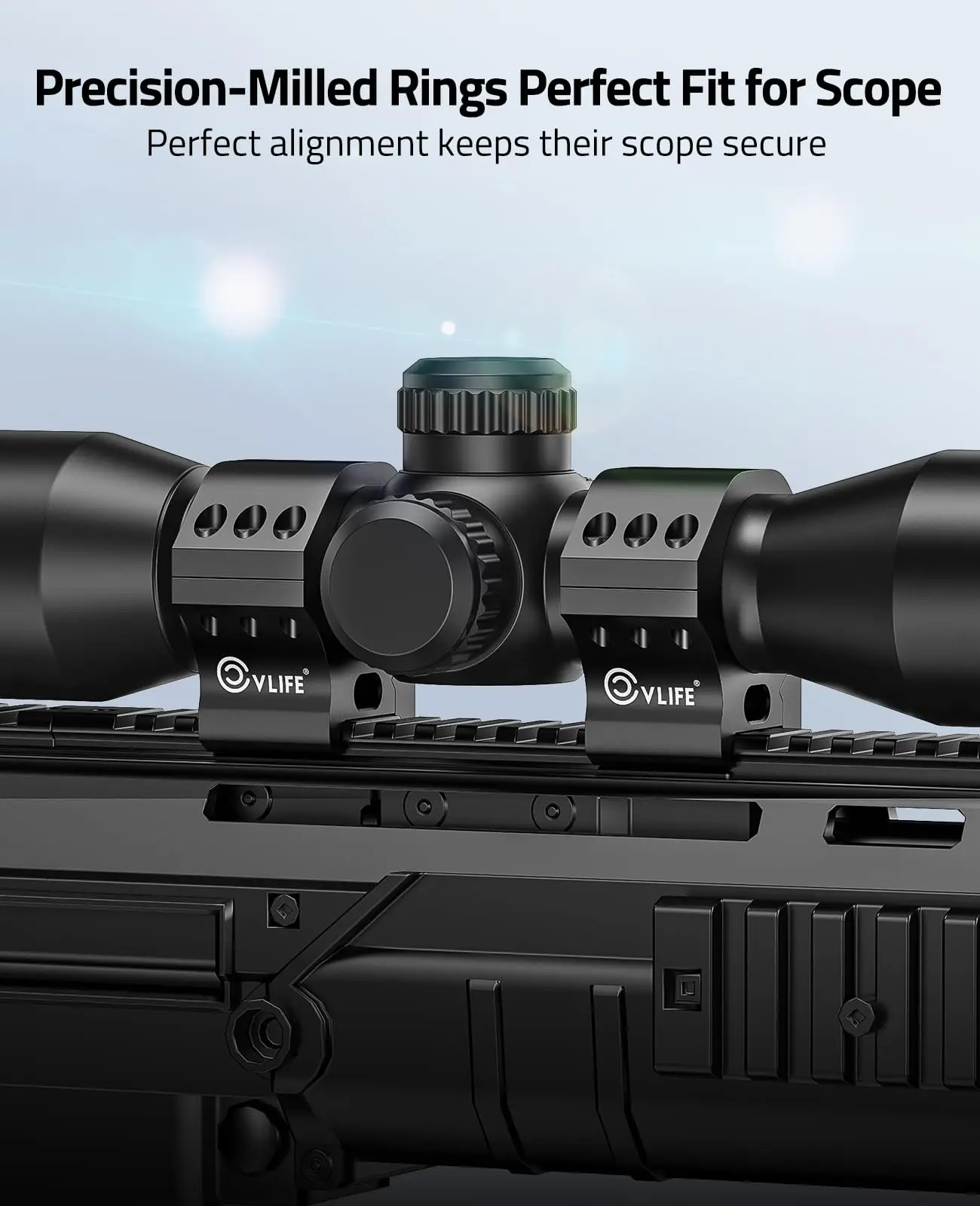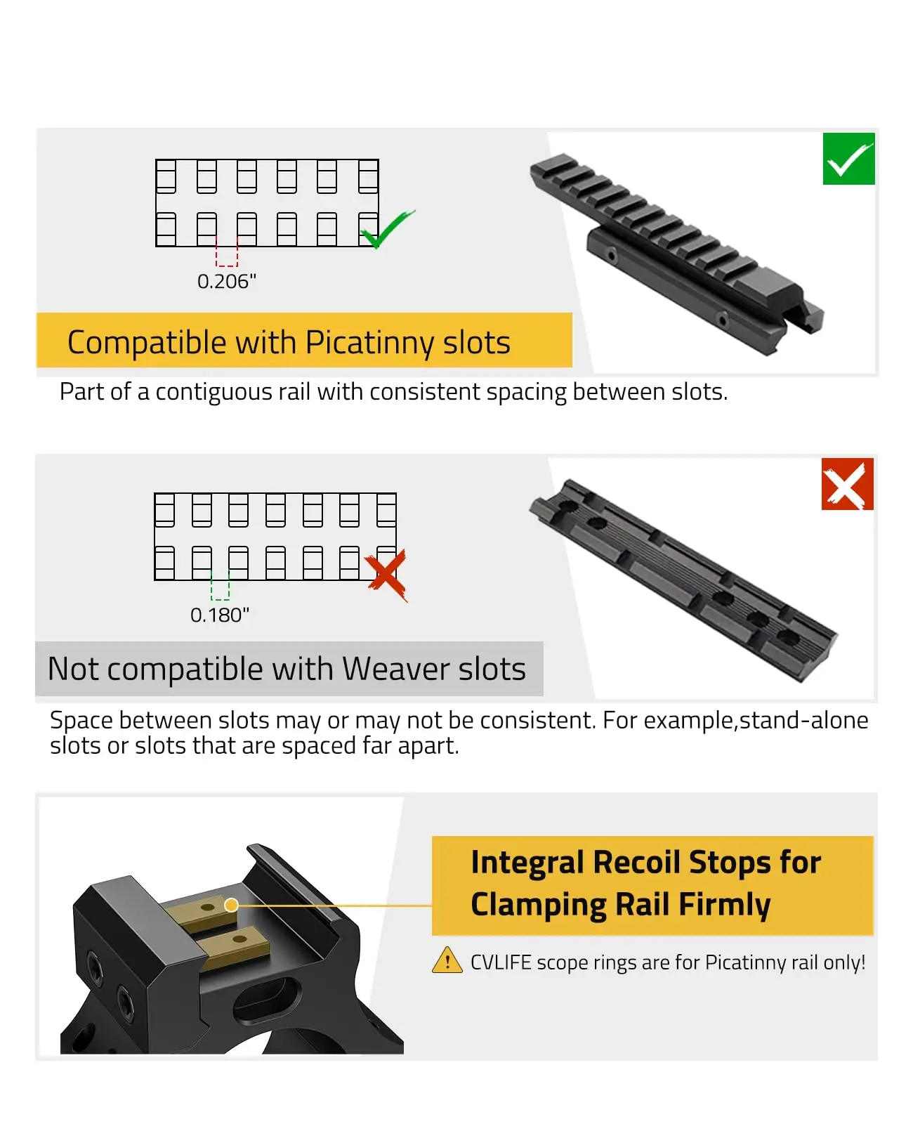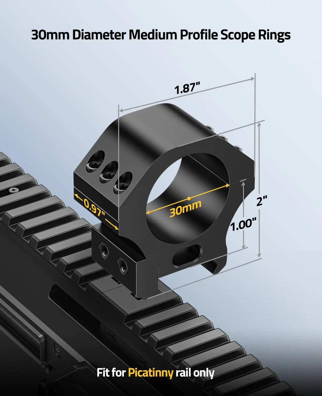 Anillos de alcance de caza de perfil medio: los anillos de alcance de 30 mm picatinny colocan el centro del tubo de alcance a 1,00 pulgadas de la base.Adecuado solo para rieles Picatinny, no compatible con rieles Weaver.