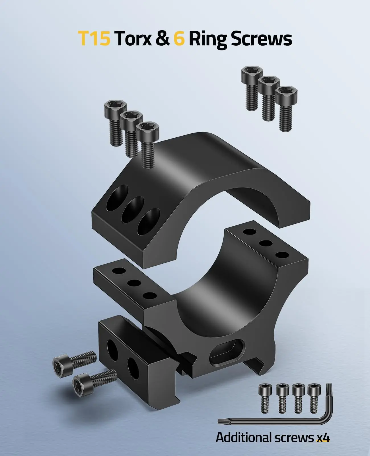 Kit de montaje de alcance liviano y resistente: el paquete viene con anillos de alcance de tubo de 30 mm x2, llave T15 x1 y tornillos de repuesto x4.Elaborado con un diseño reductor de peso.