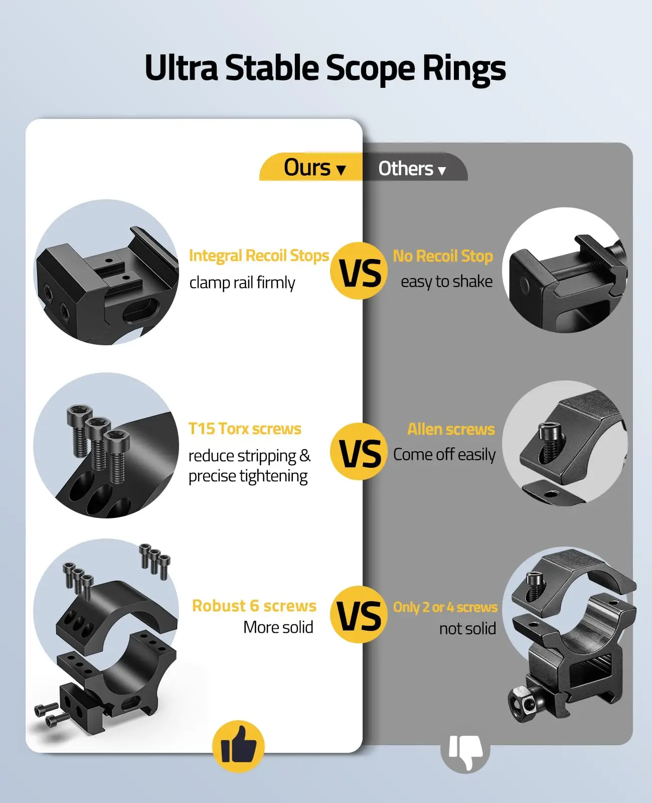 Anillos de alineación de precisión premium: fabricados con aleación de aluminio 6061-T6 y con un acabado anodizado negro mate para resistencia a rayones y imperfecciones.Los anillos de nuestra óptica se someten a mecanizado CNC con meticulosa atención al detalle, lo que garantiza una mayor precisión.