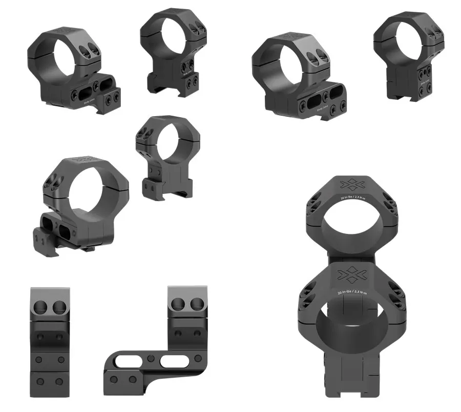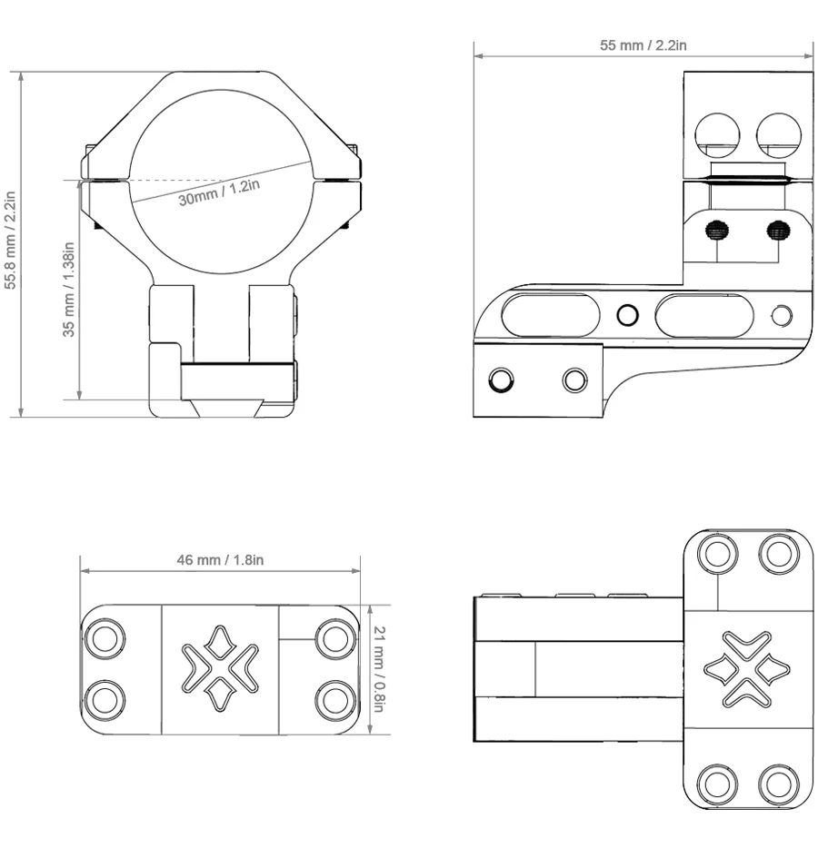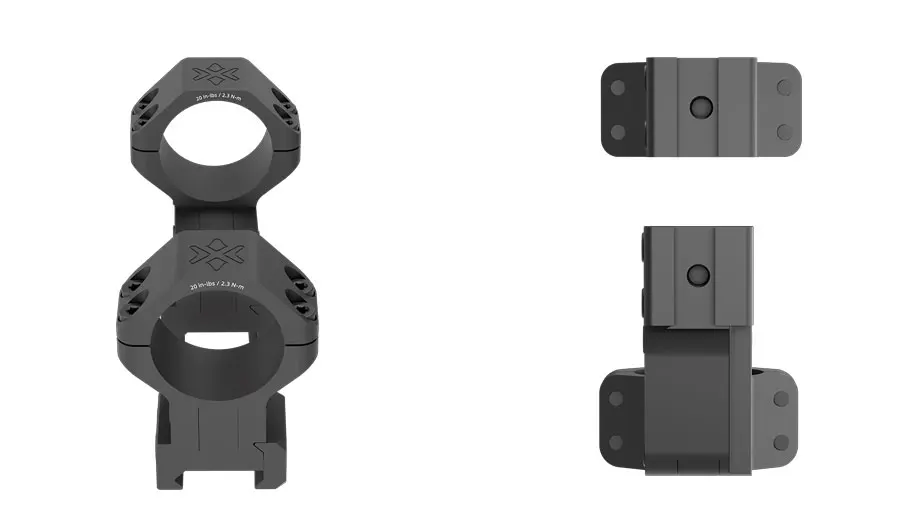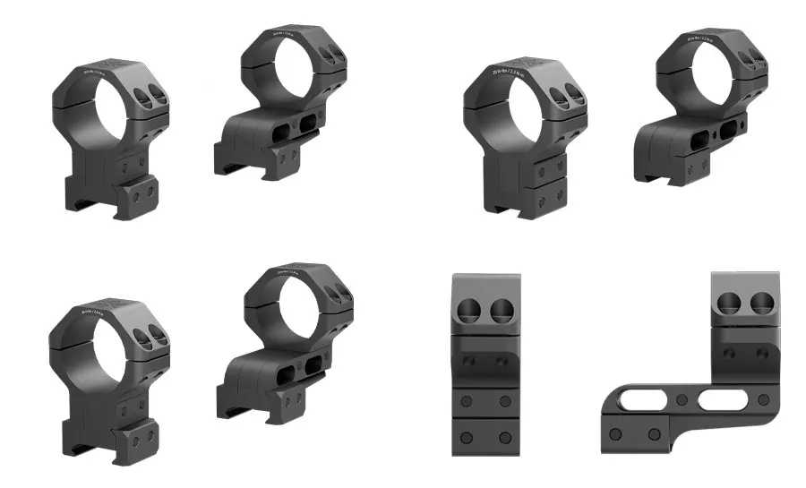 Cuatro pernos cruzados de montaje por anillo, ultrafueros y estables, se ajustan al montaje Picatinny y Weaver.