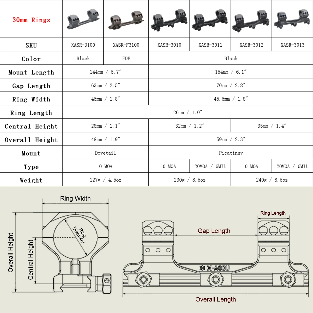 Anillos de Montaje Vector Optics X-ACCU 30/34mm de Una Pieza Dovetail & Picatinny 0/20 MOA con Mecanizado CNC para Rieles de 9mm/20mm