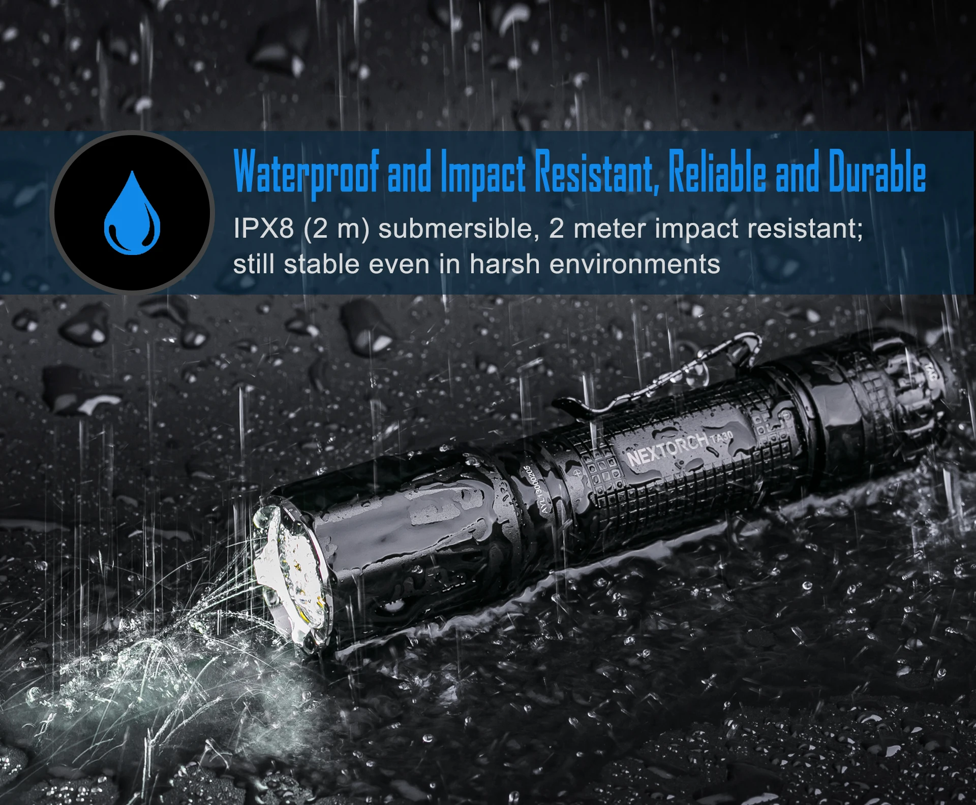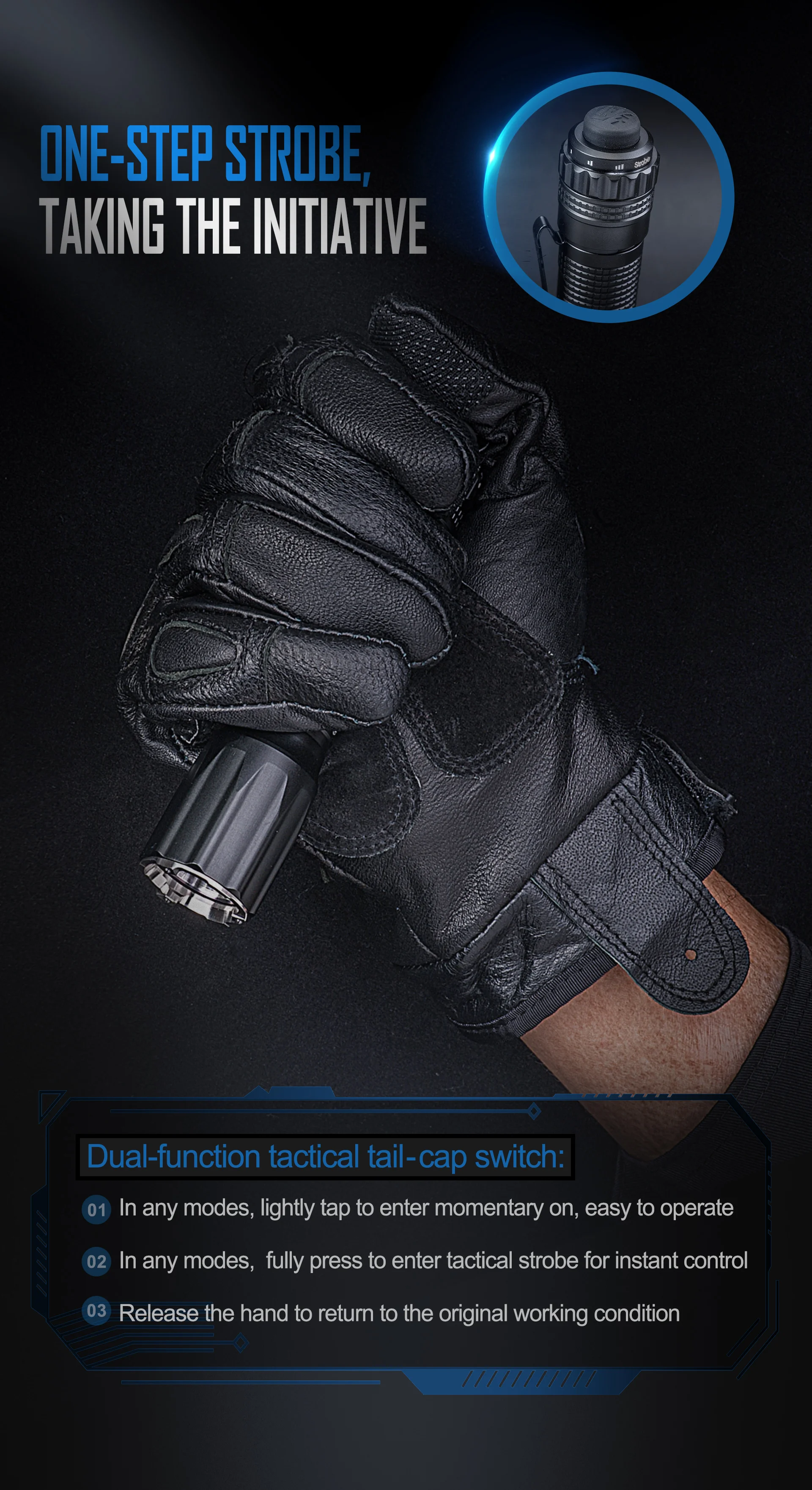 2. Interruptor táctico de doble paso trasero, luz táctica táctil ligera en cualquier modo, pulsación intensa de un flash de ráfaga de tecla, para garantizar una activación precisa incluso en entornos tácticos de alta presión.