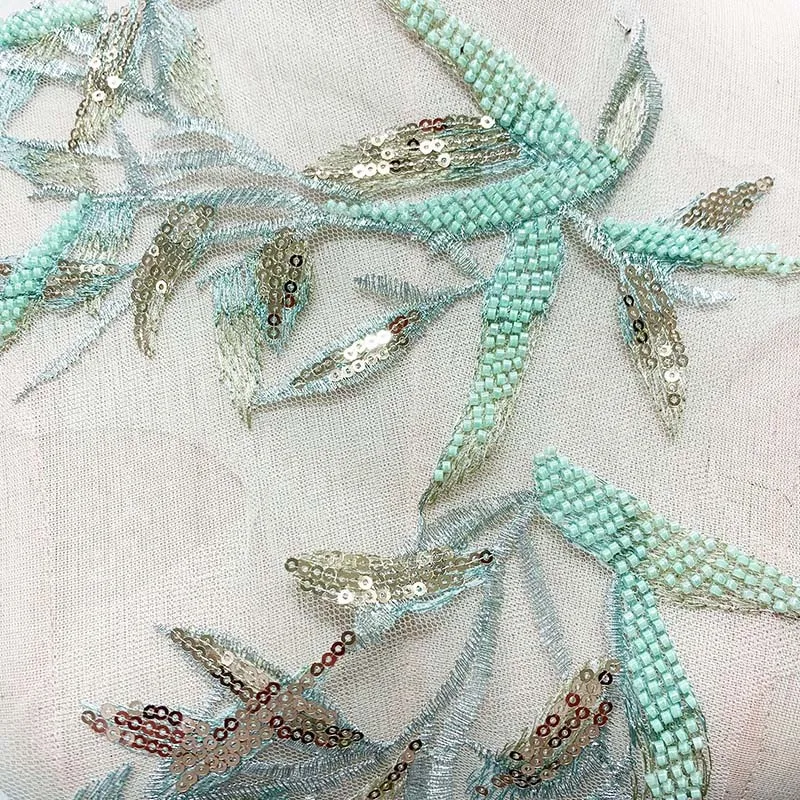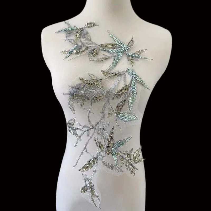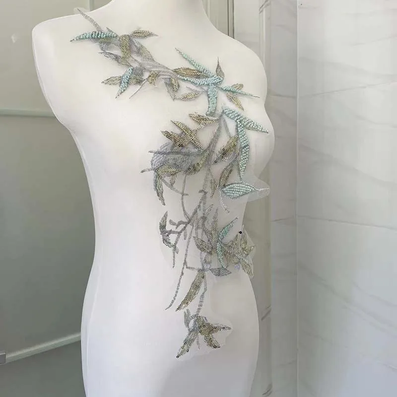 Apliques de encaje de hoja de bambú, adornos de costura, bordado Floral con cuentas de lentejuelas, parches para coser, decoración DIY para vestido de fiesta, 43x30CM